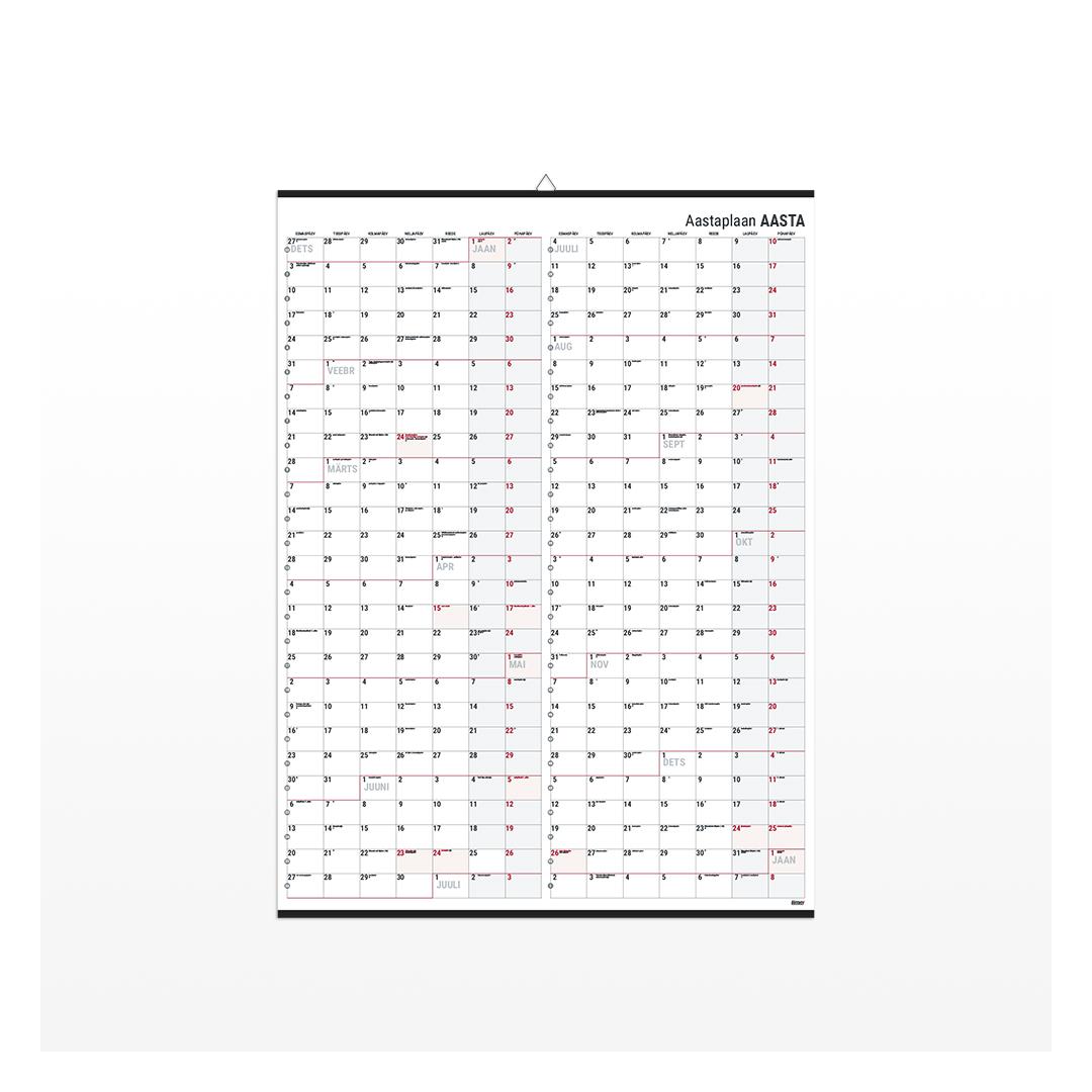 Размер: 590 x 800 мм Двухцветный настенный календарь Календарь в тубусе Металлический обод с застежкой-петлей Статический маркер даты Язык: эстонский и английский ГОДОВОЙ ПЛАН включает в себя следующее: национальные праздники, даты национального календаря, дни флага, фазы луны, информацию о сокращенном рабочем дне, переходе на летнее и зимнее время.