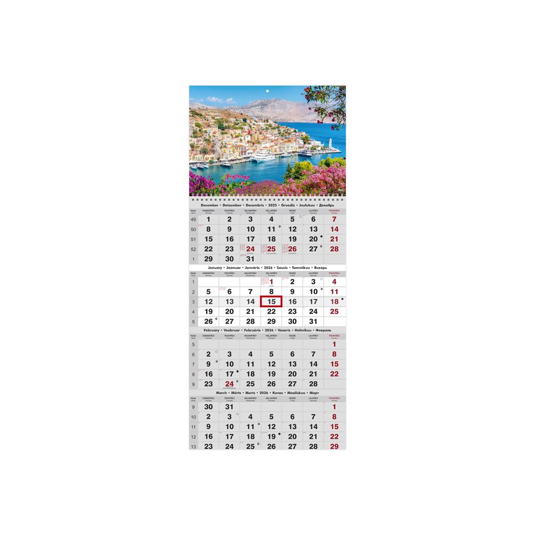 Размер: 297 x 690 мм Спиральный переплет Отверстие для подвешивания Объем содержимого 12 страниц Маркер даты Содержание темно-серый/красный Язык: эстонский, английский, латышский, литовский, финский, русский Календарь включает в себя следующее: национальные праздники, 37 национальных праздников с сокращениями, луна фазы, номер недели, предыдущий и 2 следующих месяца.