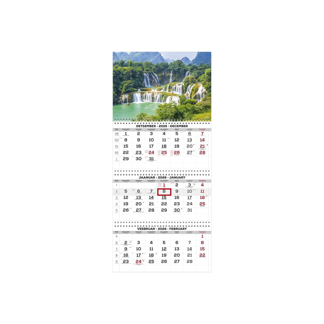 Размер: 297 x 650 мм Трехчастный спиральный переплет Отверстие для подвешивания Объем содержимого 3 x 12 страниц Маркер даты Содержание темно-серый/красный Язык: эстонский и английский Календарь включает в себя следующее: государственные праздники, государственные и национальные календарные годовщины, дни флага, национальные праздники 37 стран с сокращениями, смена летнего и зимнего времени, время восхода и захода Солнца (Таллинн), фазы луны с указанием времени, знаки зодиака, начало сезонов с указанием времени, предыдущий и следующий месяц, номер недели.
