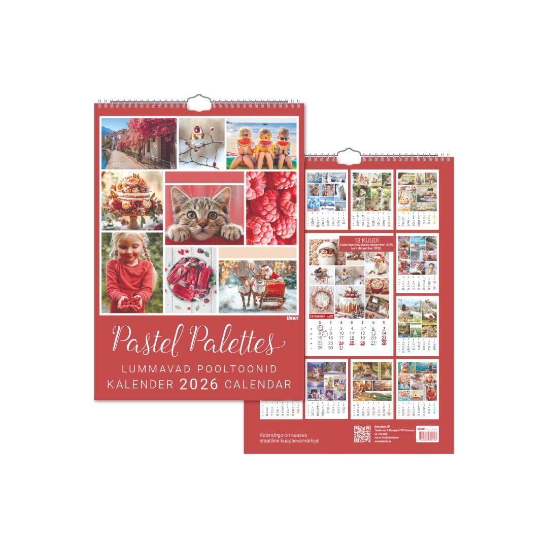 Размер: 297 х 420 мм. Спиральный переплет. Петля для подвешивания. Статический маркер даты. 13 месяцев! Язык: эстонский Календарь содержит следующее: государственные праздники, национальные и национальные календарные праздники, дни флага, начало сезонов с указанием времени, пропущенные четверги, номер недели, календарь на следующий год.