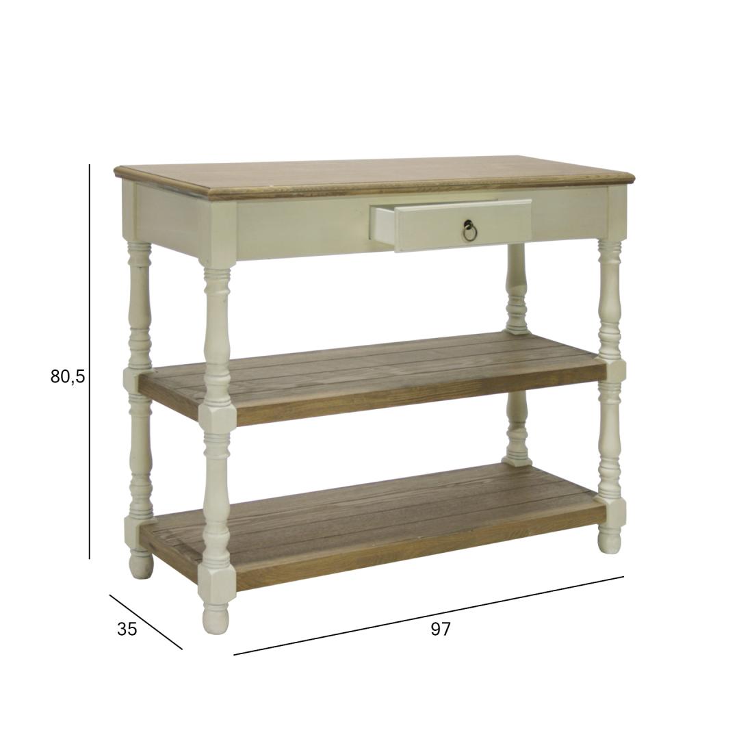 Abilaud SAMIRA 97x35xH80,5cm, antiikvalge/naturaalne. Laua jalad ja alusraam on valmistatud saarepuidust ja viimistletud antiikvalge värviga. MDF lauaplaat on kaetud naturaalse paulownia spooniga. Vaheriiulid on valmistatud täispuidust. Laual on üks väike ilma siinideta sahtel. Sahtli käepide on metallist.