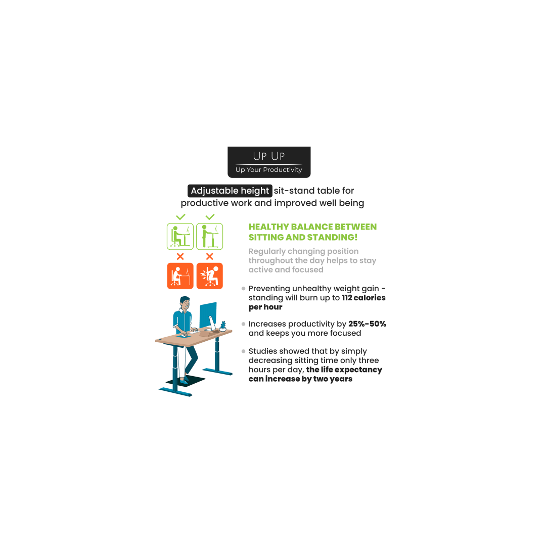 Ergonomic Up Up tables are a great choice for your workplace. Thanks to the height-adjustable, you can adjust the height of the table to yourself and constantly change position and work both sitting and standing.
