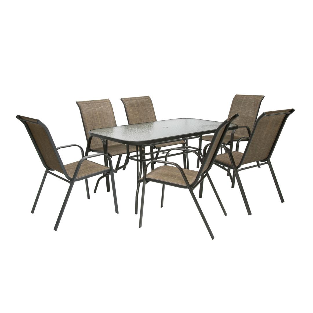Aiamööblikomplekt DUBLIN laud ja 6 tool, kuldpruun. Laua mõõdud on 150x90xH70cm. Lauaplaat: 5mm läbipaistev laineline klaas. Laua keskel on päikesevarjuauk D4cm. Laua ja toolide raam ja jalad on valmistatud terasest ja viimistletud tumepruuni pulbervärviga. Tooli textilene iste laseb hästi õhku läbi, kuivab kiiresti ja seda on lihtne puhastada. Toolid on virnastatavad ning nende hoiustamine on lihtne ja ruumi säästev. Tooli üldmõõdud on 55,5x73xH90cm. Istme laius 45cm, istme sügavus 41cm, istme kõrgus 44cm. Seljatoe kõrgus 57cm. Käetoe kõrgus maast 61cm. Kaalupiirang 100kg.