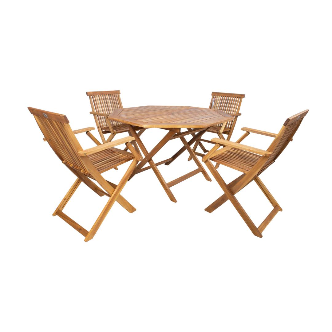 Aiamööblikomplekt FINLAY laud ja 4 käetugedega tooli. Laud ja toolid on valmistatud akaatsiapuidust ja viimistletud puidukaitseõliga. Laua mõõdud on 120x120xH72cm. Tooli üldmõõdud on 54x57xH86cm. Istme laius on 43cm, istme sügavus 39cm ja istme kõrgus 45,5cm. Kaalupiirang 90kg. Toode on muutlikes ilmastikuoludes vastupidav. HOOLDUS: puit on elav looduslik materjal, mille välisilme ilmastikutingimuste tõttu muutub. Puhastage mööblit regulaarselt, kaitske liigniiskuse ja UV kiirguse eest. Kerge lihvimine ja uus õlikiht vähemalt korra aastas on piisav värskenduskuur mööblile uue näo andmiseks. HOIUSTAMINE: suvehooaja lõppedes soovitame aiamööblit hoiustada siseruumides. Puhastage ja kuivatage mööbel enne hoiule panekut. Kasutage hoiustamiseks kuiva ning hea ventilatsiooniga ruumi. Kaitske mööblit hoiustamise ajal otsese päikesevalguse eest. Aiamööblikomplekt FINLAY laud ja 4 käetugedega tooli. Laud ja toolid on valmistatud akaatsiapuidust ja viimistletud puidukaitseõliga. Laua mõõdud on 120x120xH72cm. Tooli üldmõõdud on 54x57xH86cm. Istme laius on 43cm, istme sügavus 39cm ja istme kõrgus 45,5cm. Kaalupiirang 90kg. Toode on muutlikes ilmastikuoludes vastupidav. HOOLDUS: puit on elav looduslik materjal, mille välisilme ilmastikutingimuste tõttu muutub. Puhastage mööblit regulaarselt, kaitske liigniiskuse ja UV kiirguse eest. Kerge lihvimine ja uus õlikiht vähemalt korra aastas on piisav värskenduskuur mööblile uue näo andmiseks. HOIUSTAMINE: suvehooaja lõppedes soovitame aiamööblit hoiustada siseruumides. Puhastage ja kuivatage mööbel enne hoiule panekut. Kasutage hoiustamiseks kuiva ning hea ventilatsiooniga ruumi. Kaitske mööblit hoiustamise ajal otsese päikesevalguse eest.