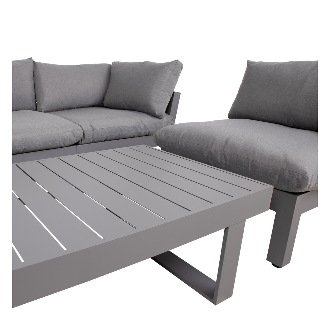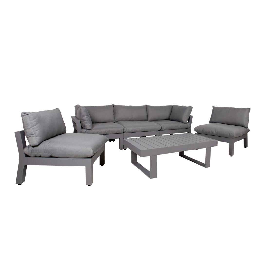Aiamööblikomplekt FLUFFY mooduldiivan ja laud. Komplekti kuulub 2 nurgamoodulit, 3 vahemoodulit ja diivanilaud. Moodulite paigutust ja järjekorda on lihtne muuta. Diivani moodulite raamid ja laud on valmistatud alumiiniumist ja viimistletud halli pulbervärviga. Laua mõõdud on 133x73,5xH42cm. Nugamooduli mõõdud on 93x93xH66cm, vahemooduli mõõdud on 82x93xH66cm. Istmemoodulite põhjas on laiad põimitud rihmad, mida katab 3cm poroloonmatt. Paksud ja pehmed padjad ning elastne istmepõhi tagavad suurepärase istumismugavuse. Istme kõrgus raami ääreni on 35cm, koos padjaga 51cm. Istmepatjade mõõdud on 87x87xH16cm, seljatoepatjade mõõdud on 87x43x18cm, 72x43x16cm. Padjakatted on valmistatud hallist polüesterkangast. Padjakatted on eemaldatavad ja pestavad. Toode on muutlikes ilmastikutingimustes hästi vastupidav ja lihtsalt hooldatav. Kaitset ilmastikuolude eest vajavad ainult padjad. Hea lahendus patjade igapäevaseks hoiustamiseks ja kuivana hoidmiseks on padjakast. Välitingimustes kasutatava mööbli eluea pikendamiseks soovitame kasutada välimööbli katteid. HOIUSTAMINE: suvehooaja lõppedes soovitame aiamööblit hoiustada siseruumides. Puhastage ja kuivatage mööbel enne hoiule panekut. Kasutage hoiustamiseks kuiva ning hea ventilatsiooniga ruumi. Aiamööblikomplekt FLUFFY mooduldiivan ja laud. Komplekti kuulub 2 nurgamoodulit, 3 vahemoodulit ja diivanilaud. Moodulite paigutust ja järjekorda on lihtne muuta. Diivani moodulite raamid ja laud on valmistatud alumiiniumist ja viimistletud halli pulbervärviga. Laua mõõdud on 133x73,5xH42cm. Nugamooduli mõõdud on 93x93xH66cm, vahemooduli mõõdud on 82x93xH66cm. Istmemoodulite põhjas on laiad põimitud rihmad, mida katab 3cm poroloonmatt. Paksud ja pehmed padjad ning elastne istmepõhi tagavad suurepärase istumismugavuse. Istme kõrgus raami ääreni on 35cm, koos padjaga 51cm. Istmepatjade mõõdud on 87x87xH16cm, seljatoepatjade mõõdud on 87x43x18cm, 72x43x16cm. Padjakatted on valmistatud hallist polüesterkangast. Padjakatted on eemaldatavad ja pestavad. Toode on muutlikes ilmastikutingimustes hästi vastupidav ja lihtsalt hooldatav. Kaitset ilmastikuolude eest vajavad ainult padjad. Hea lahendus patjade igapäevaseks hoiustamiseks ja kuivana hoidmiseks on padjakast. Välitingimustes kasutatava mööbli eluea pikendamiseks soovitame kasutada välimööbli katteid. HOIUSTAMINE: suvehooaja lõppedes soovitame aiamööblit hoiustada siseruumides. Puhastage ja kuivatage mööbel enne hoiule panekut. Kasutage hoiustamiseks kuiva ning hea ventilatsiooniga ruumi.