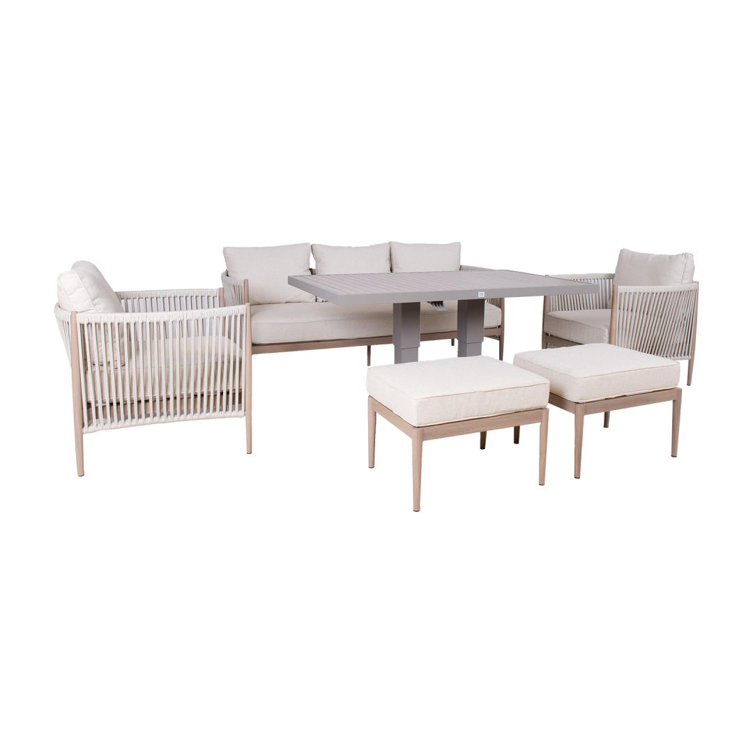 Aiamööblikomplekt MEDINA laud, diivan, 2 tugitooli ja 2 tumbat, beež
