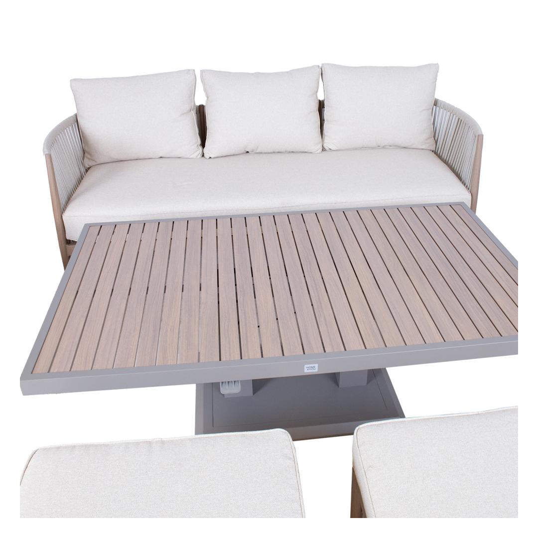 Aiamööblikomplekt MEDINA muudetava kõrgusega laud, 3-kohaline diivan, 2 tugitooli ja 2 tumbat, beež.