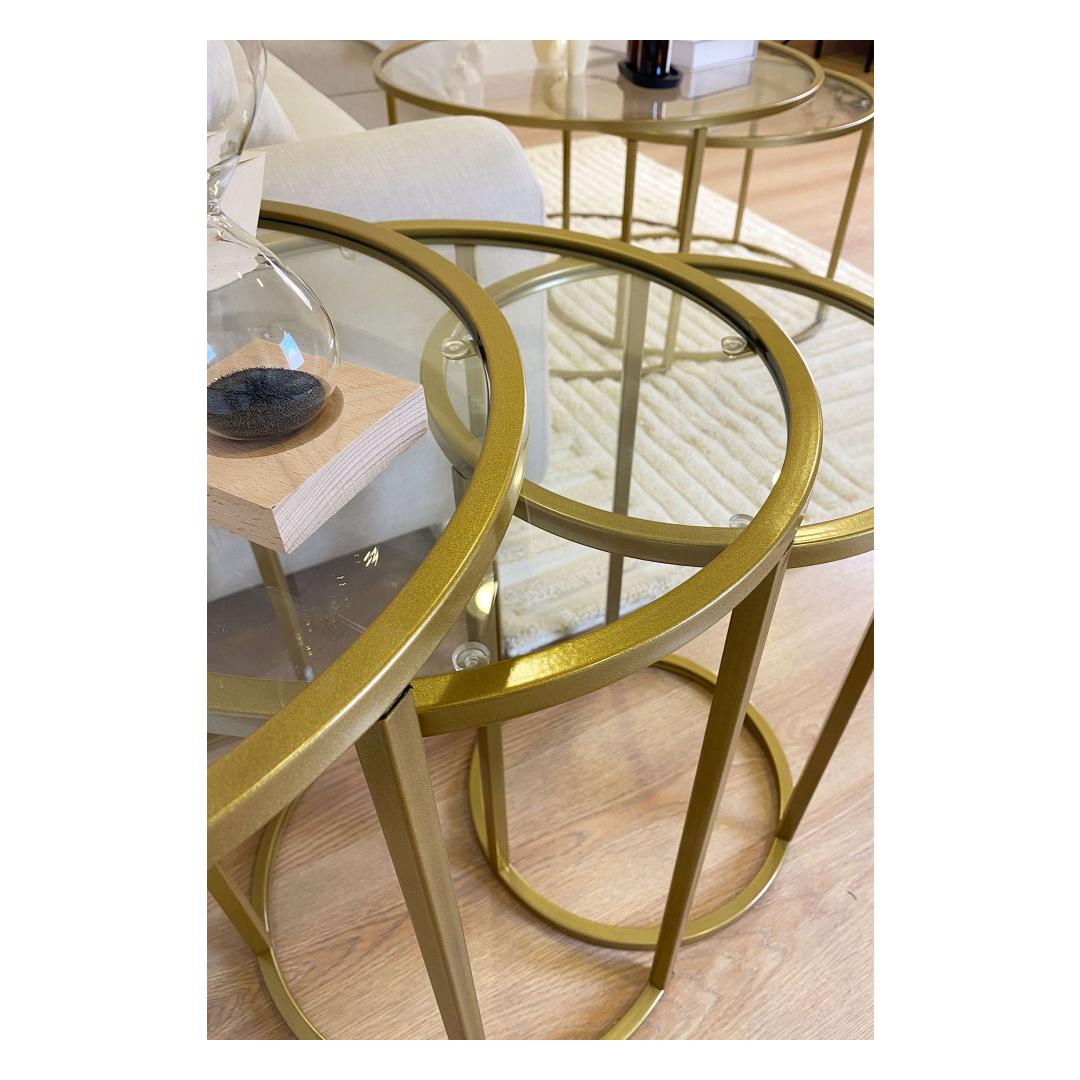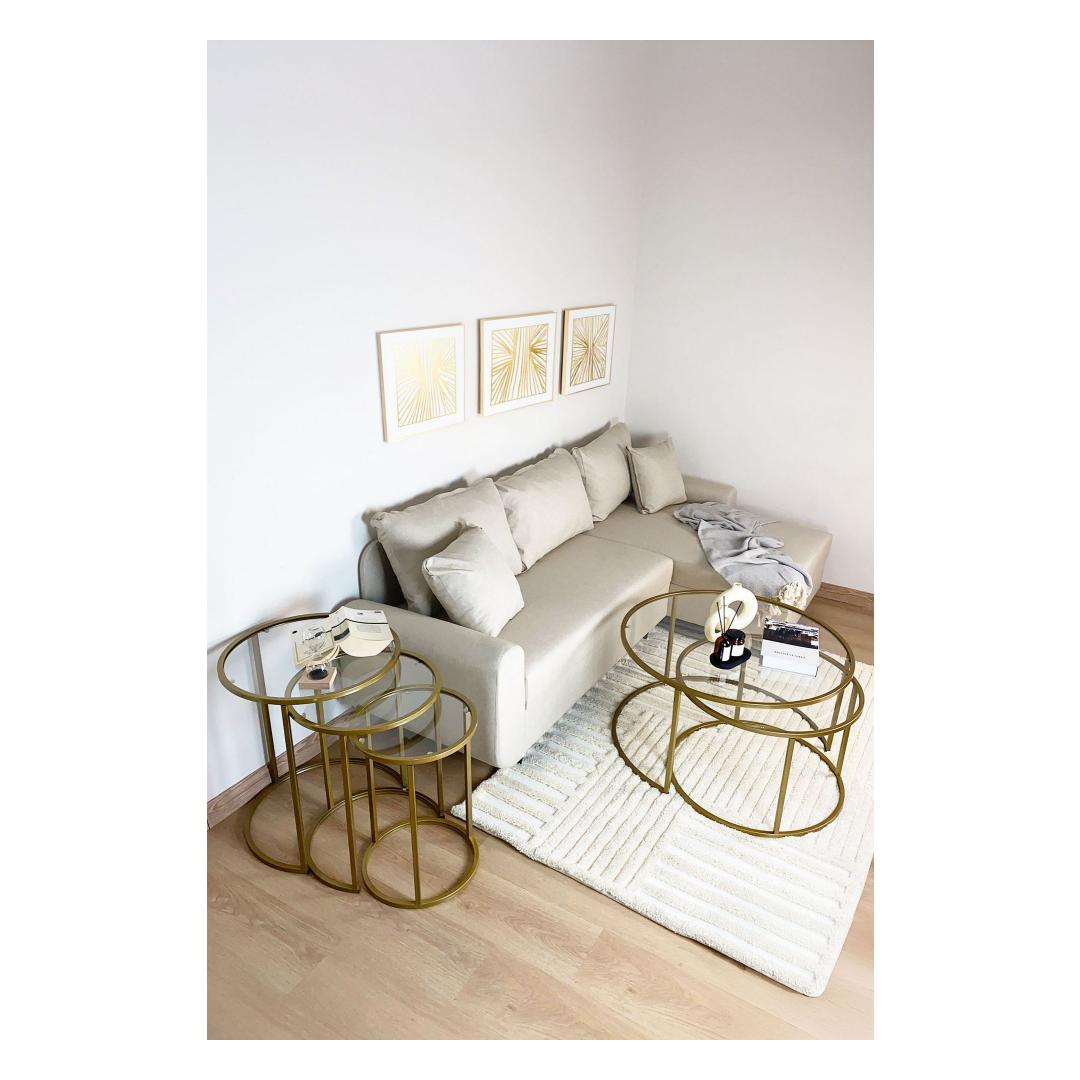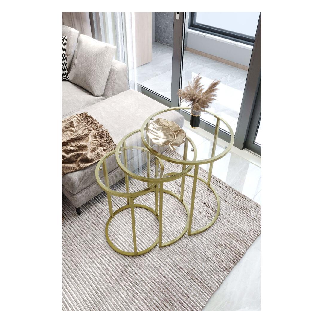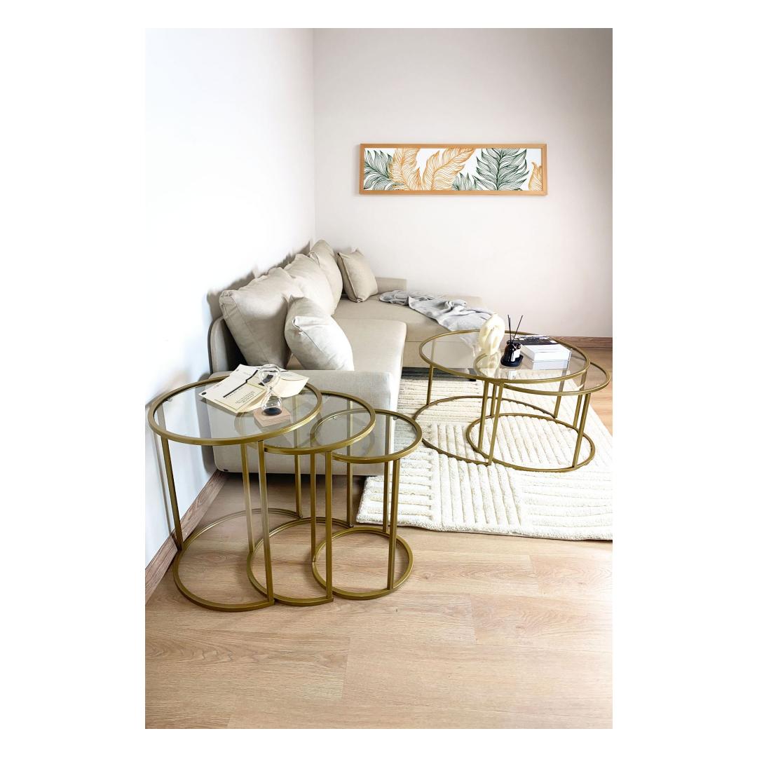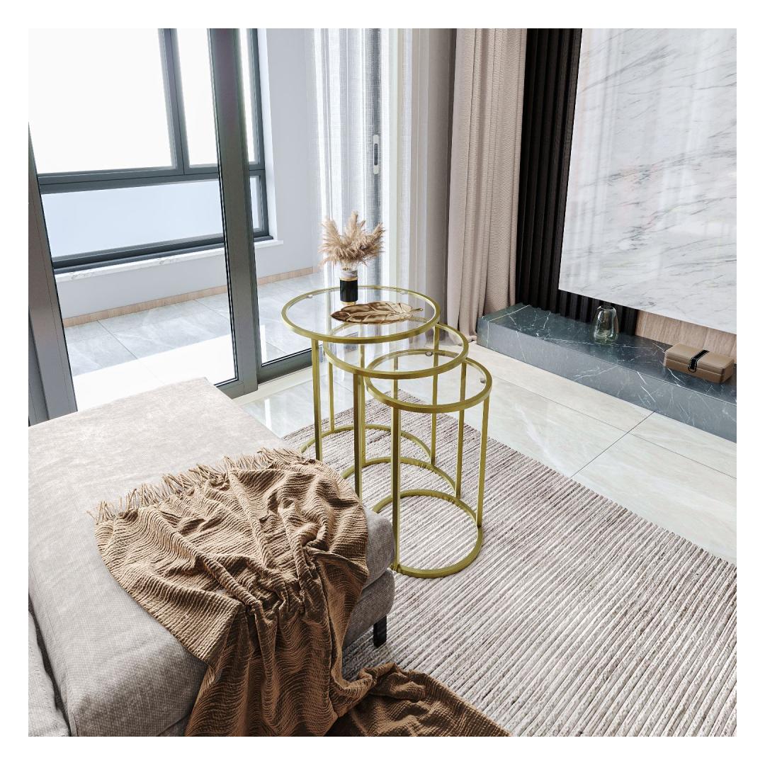 Kas otsite, kuidas lisada oma eluruumi elegantsi ja rafineeritust? Siis ei pea te enam otsima, meie kauni pesatablettide komplekti juurest! See 3 laua komplekt on valmistatud 100% karastatud selgest klaasist, andes sellele stiilse ja modernse ilme, mis tõstab iga ruumi hetkega. Kuldne metallraam lisab luksuse puudutuse, samas kui läbipaistev klaasist pind loob avaruse ja valguse tunde.