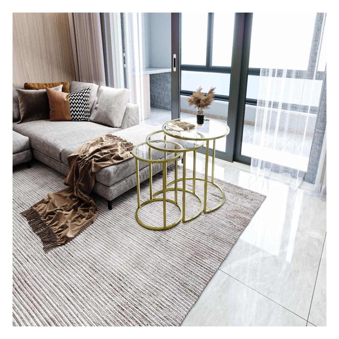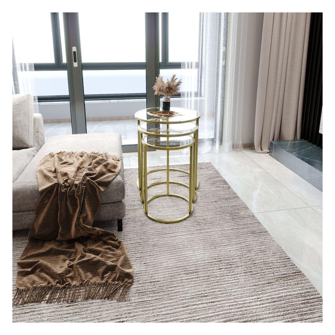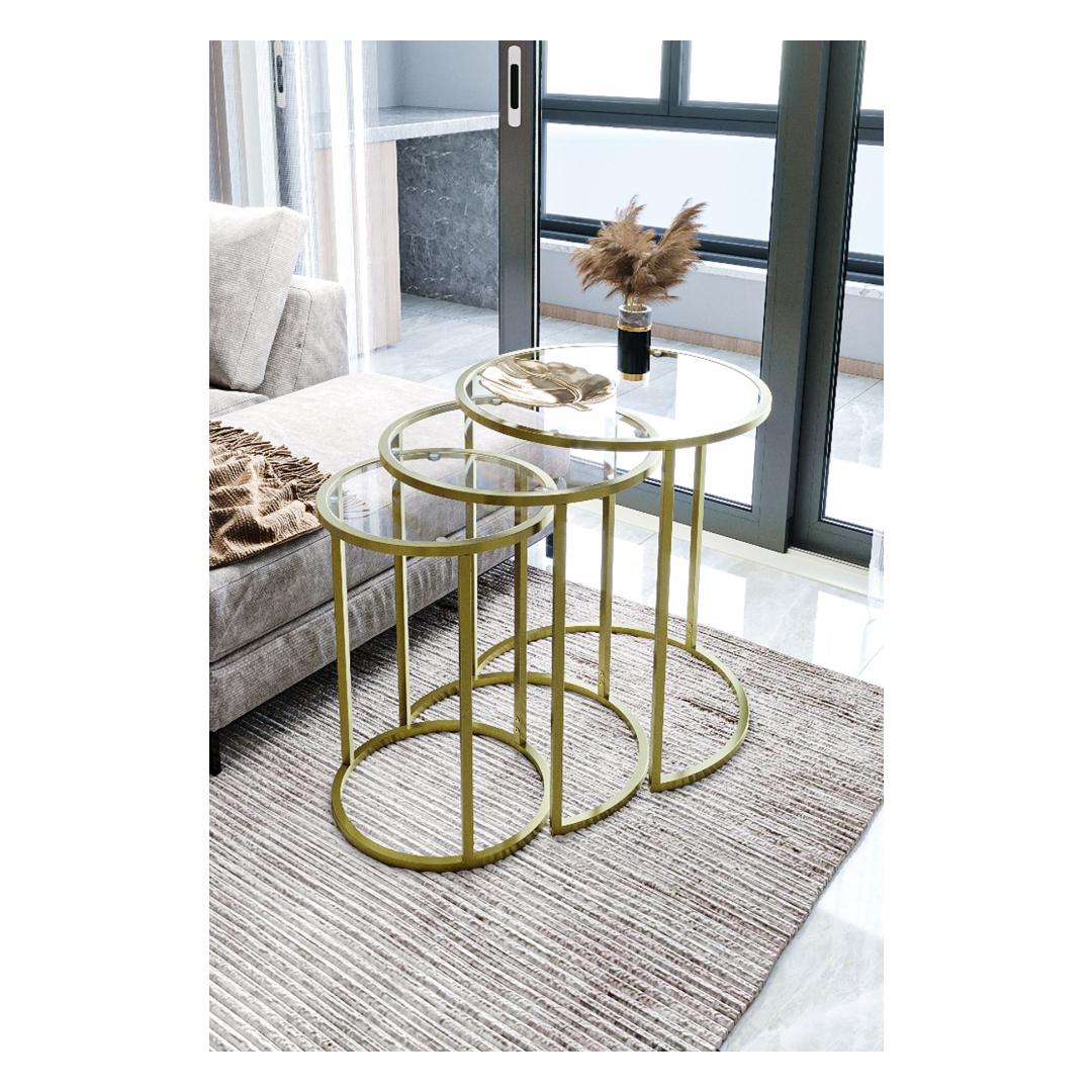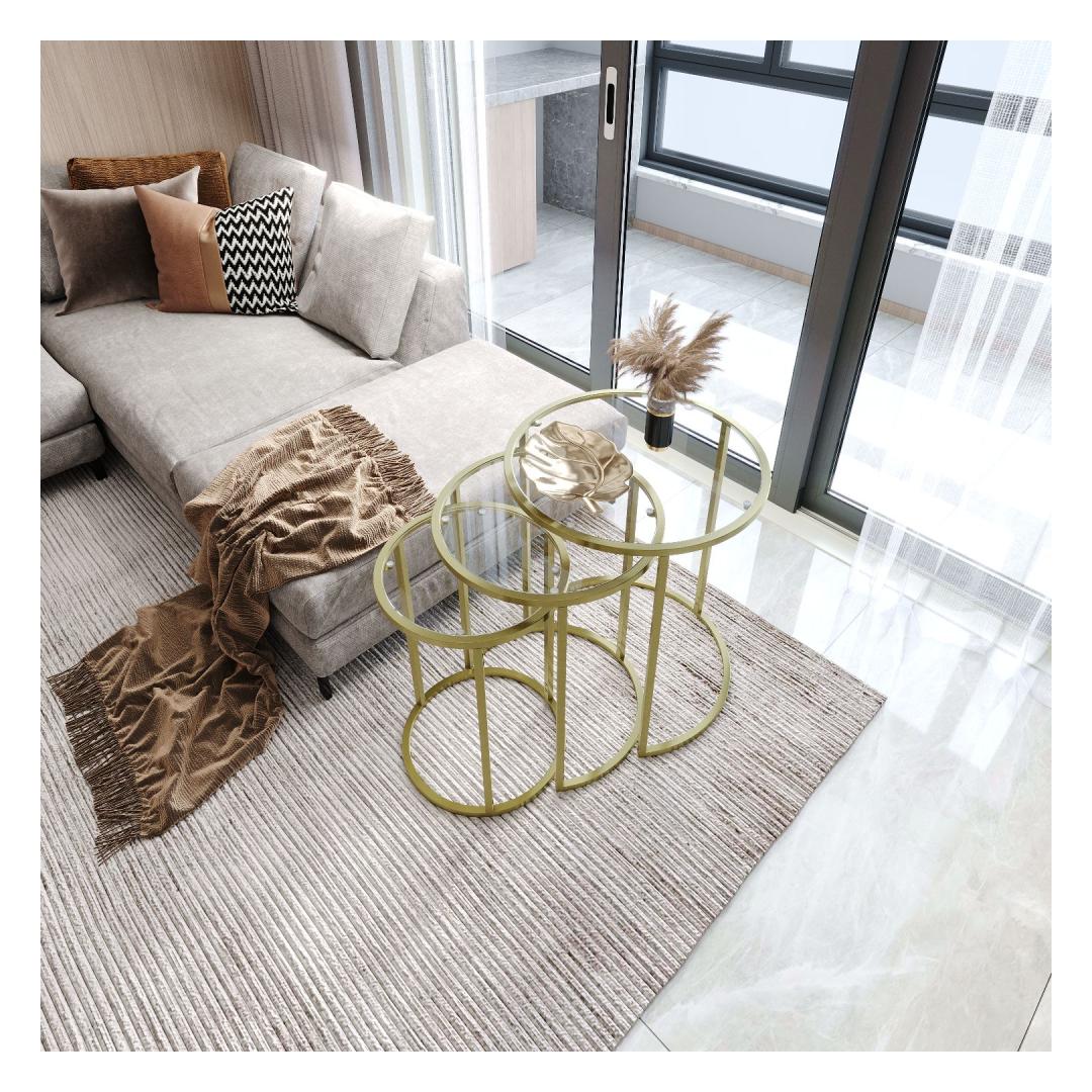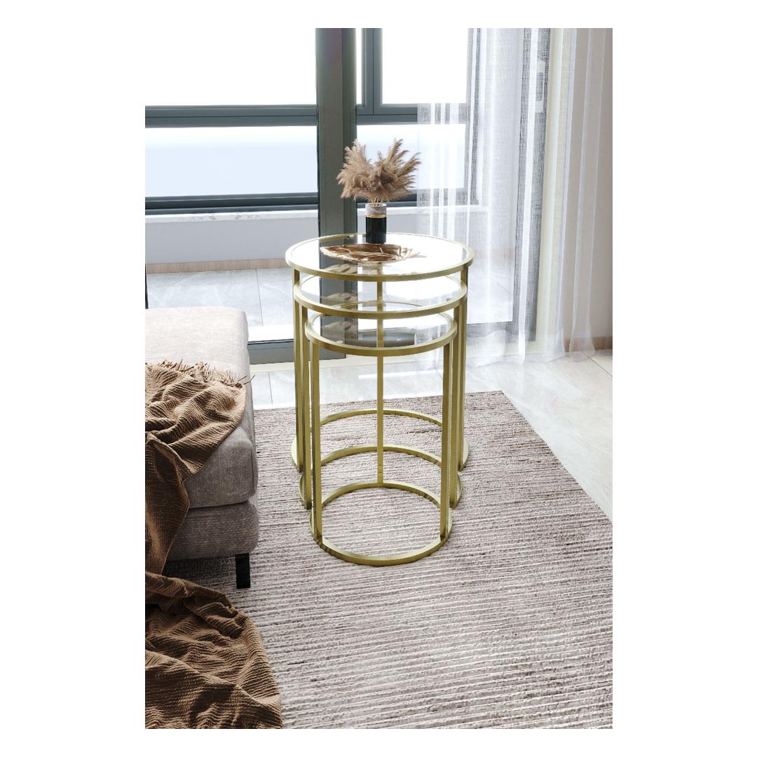 Kas otsite, kuidas lisada oma eluruumi elegantsi ja rafineeritust? Siis ei pea te enam otsima, meie kauni pesatablettide komplekti juurest! See 3 laua komplekt on valmistatud 100% karastatud selgest klaasist, andes sellele stiilse ja modernse ilme, mis tõstab iga ruumi hetkega. Kuldne metallraam lisab luksuse puudutuse, samas kui läbipaistev klaasist pind loob avaruse ja valguse tunde.