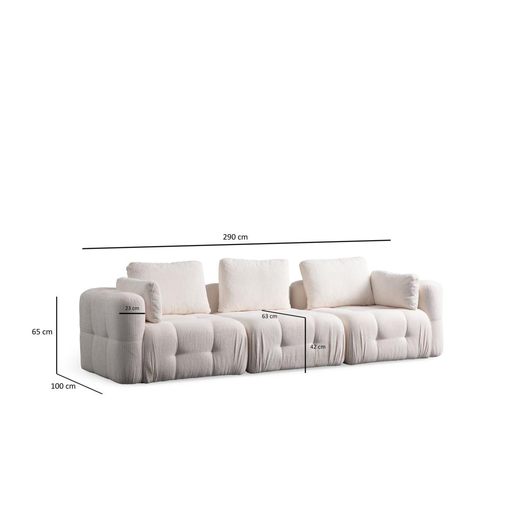 Muuda oma elutuba hubaseks oaasiks meie luksusliku 3-kohalise diivani abil. Tugevast PÄRNUMEEST ja OSB-st valmistatud raamiga on see diivan loodud kestma aastaid. 100% POLÜESTER kangas lisab sinu ruumile elegantsi ja mugavust, muutes selle ideaalseks kohaks lõõgastumiseks pärast pikka päeva.Koge Ükskõik Millist MugavustLangeta end pehmesse 28 DNS halli vahtu ja 24 DNS sulepatja, mis pakuvad ideaalset tasakaalu toe ja pehmuse vahel. 60% lõigatud vaht ja 40% silikoonvaht seljapatjad kohanduvad sinu kehaga, et tagada maksimaalne lõõgastus. Kolme seljapatja ja kahe külgpatja abil saad kohandada oma istumiskogemust maksimaalse mugavuse nimel.Elegantne Disain, Kestvad KvaliteetSelle diivani elegantne disain on täiustatud väikeste mustade plastjalustega, mis lisavad sinu ruumile modernset puudutust. Valge värv annab puhta ja rafineeritud ilme, mis tõstab esile iga ruumi. Generoosse istme sügavusega 81 cm ja istme kõrgusega 42 cm on see diivan ideaalne lõõgastumiseks või külaliste meelelahutamiseks.Tehnilised Üksikasjad:Raam: PÄRNUMEES / OSBKangas: 100% POLÜESTERPikkus: 290 cm, Laius: 100 cm, Kõrgus: 65 cmVaht: 28 DNS pehme hall vaht / 24 DNS suleSeljapadi: 50 x 50 cm (3 tükki)Külgpadjad: 68 x 29 cm (2 tükki)Jalad: Väikesed mustad plastjalad (3 cm)Istme kõrgus: 42 cm, Istme sügavus: 81 cmSelja laius: 65 cm, Käetoe laius: 23 cmKäetoe kõrgus: 65 cmVärv: Valge Värv: White