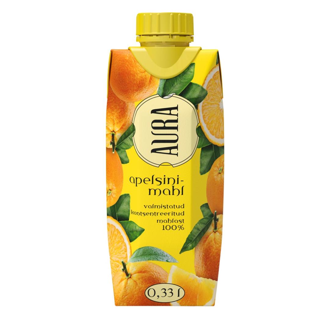 Apelsinimahl kontsentreeritud mahlast. Aura apelsinimahl valmistatud kontsentreeritud mahlast 100%. Eriliselt värske ja naturaalse maitsega, ohtralt C-vitamiini sisaldav kergelt hapukas apelsini täismahl ei sisalda lisaaineid ega suhkrut. Sobib suurepäraselt hommikuseks virgutuseks. Säilitusainevaba. Jahedalt parim.