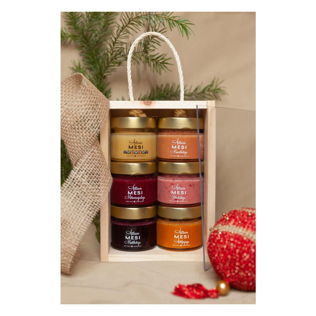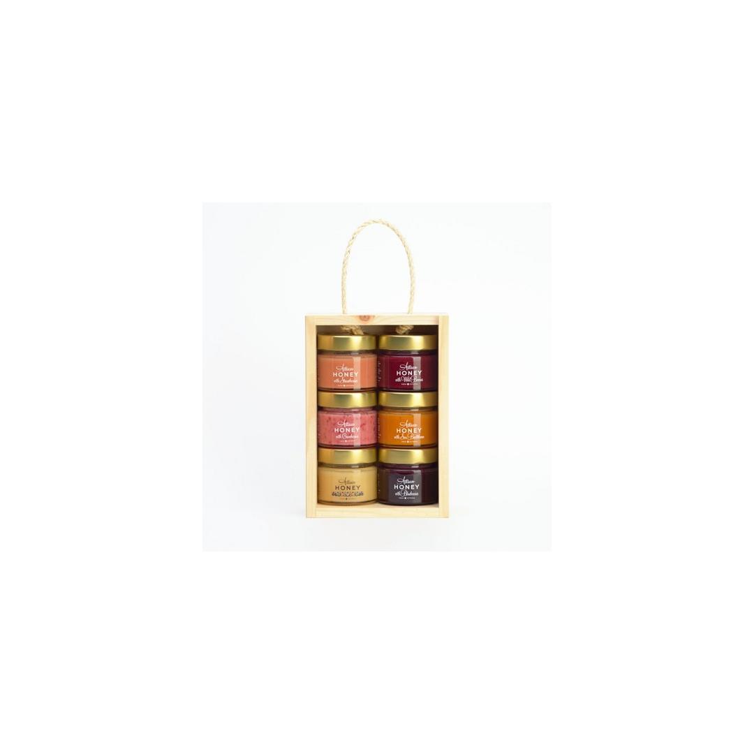 Artisan Honey assortii puidust karbis, millel läbipaistev kaas ning nöörist sang.