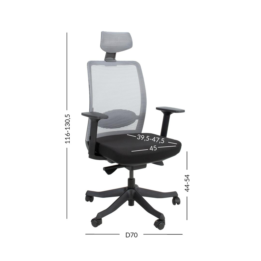 Töötool ANGGUN, must. Iste on kaetud on polüesterkangaga, 50 000 Martindale’i. Selja- ja peatugi on kaetud polüestervõrkkangaga, mis tagab hea õhu liikuvuse. Kaalutundlik sünkroonmehhanism korrigeerib kiike jäikuse automaatselt vastavalt istuja kaalule. Reguleeritav nimmetugi. Istme sügavus on reguleeritav vahemikus 39,5-47,5cm. Istme kõrgus on reguleeritav gaasamordi abil. Käetoed on mustast plastikust. Käetugede sügavus ja pöördenurk on reguleeritavad, kõrgus on reguleeritav vahemikus 21-31cm. Peatoe kõrgus on reguleeritav. 5-haruline plastikust jalarist on musta värvi, D70cm. Toolil on plastikrattad, 50mm. Tooli üldmõõdud on 70x70xH116-130,5cm. Tooli kõrgus on 116-130,5cm, seljatoe kõrgus 52,5cm (koos peatoega 72-76,5cm), istme kõrgus 42-52cm, istme sügavus 39,5-47,5cm, istme laius 45cm. Kaalupiirang 120kg.