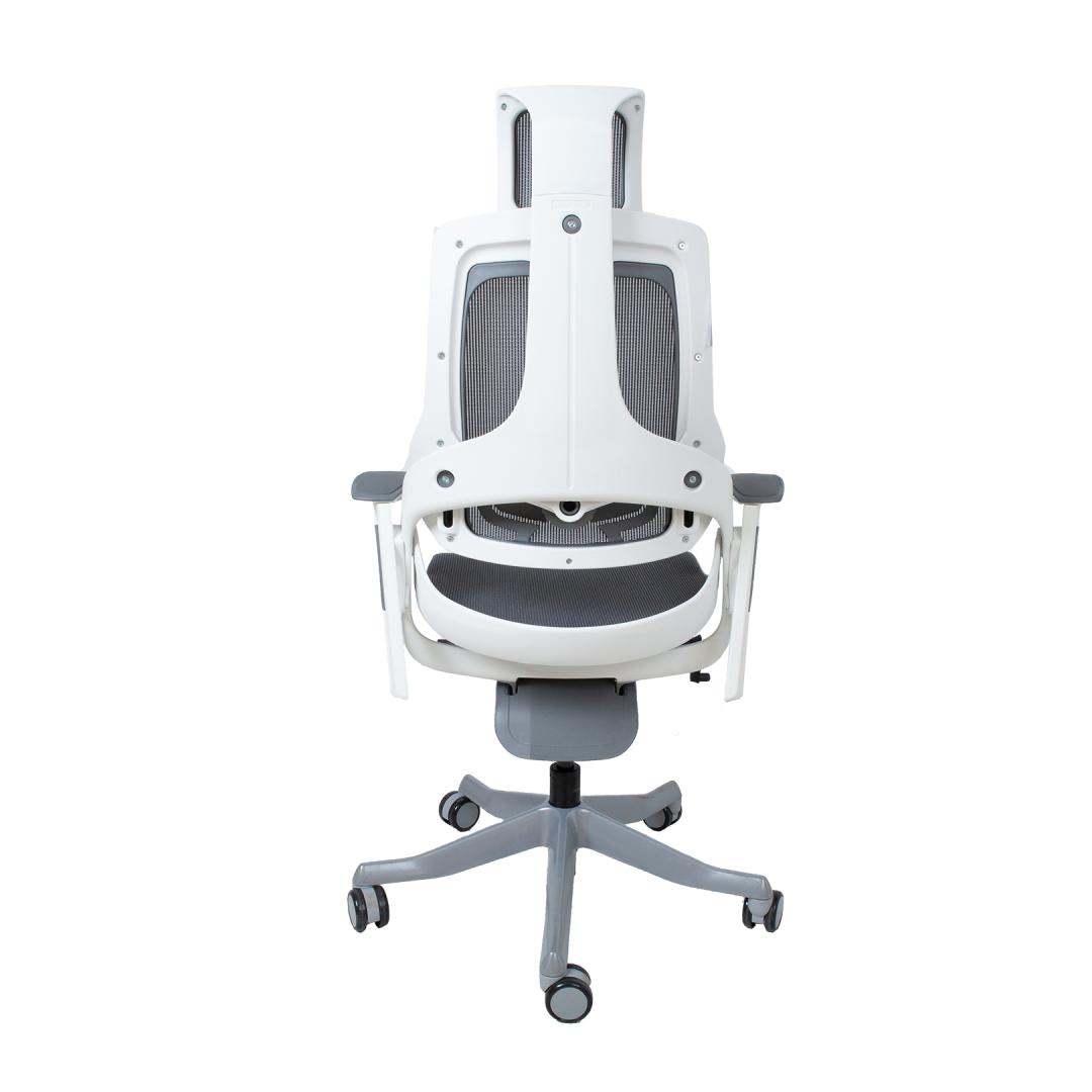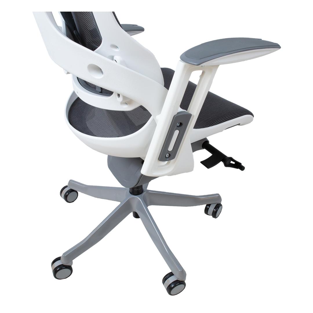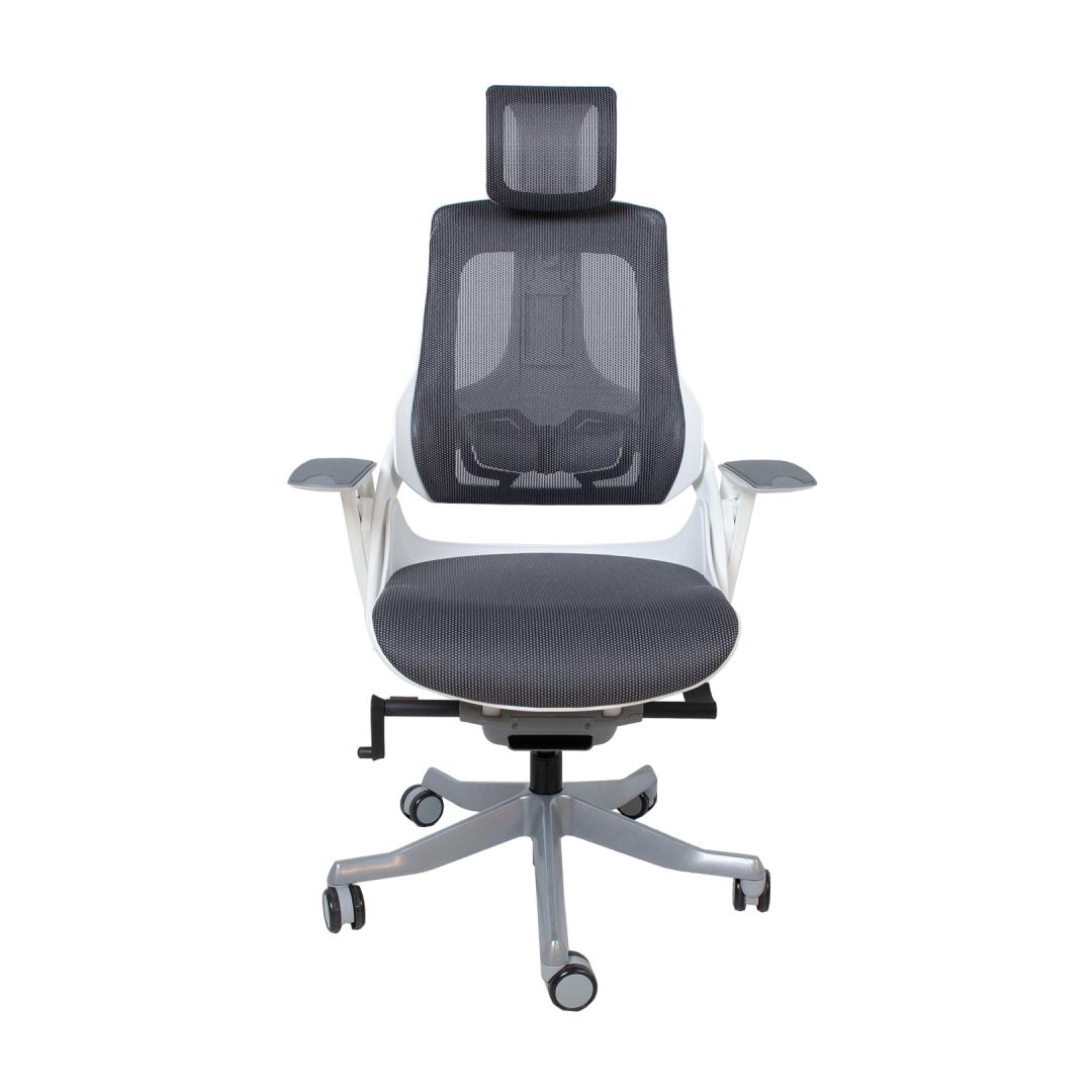 Töötool WAU hall/valge korpus. WAU toolis on ühendatud suurepärane ergonoomika ja sportlik stiil, pakkudes parimat tuge ja rahulolu terveks tööpäevaks. Tooli väliskorpus on valmistatud valgest plastikust ja raami sisemised osad on vormitud hallist plastikust (100% PP taaskasutatav). Seljatoe plastikraam on tugevdatud fiiberkiuga. Tooli iste ja seljatugi on kaetud halli võrkkangaga (76% polü-elastomeer, 24% polüester), Martindale'i väärtus 100 000. Võrkkanga koostisesse kuuluv elastomeer filamentkiud tagab materjali kõrge tõmbetugevuse ja väga hea vastupidavuse. Toolil on sünkroonmehhanism. Seljatoe kaldenurk on lukustatav ja kaldepinge tugevus reguleeritav. Istme kõrgus on reguleeritav gaasamordi abil. Pea- ja seljatoe kõrgus on reguleeritav. Toolil on reguleeritav nimmetugi. Käetugede katted on valmistatud hallist elastomeer termoplastikust. Käetugede kõrgus ja pöördenurk on reguleeritavad. Tooli 5-haruline jalarist on valmistatud valualumiiniumist ja viimistletud halli epoksiidpulbervärviga. Toolil on 60mm põrandat säästvad nailonrattad. Tooli üldmõõdud on 70x70xH112-129cm. Istme laius 47cm, istme sügavus 49cm, istme kõrgus 40-48cm. Kaalupiirang 120kg.