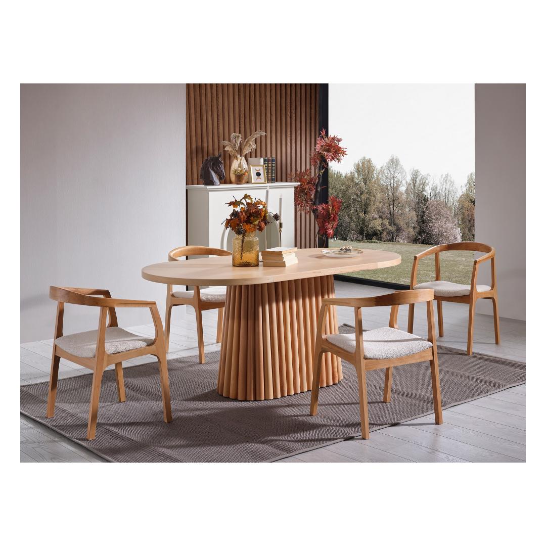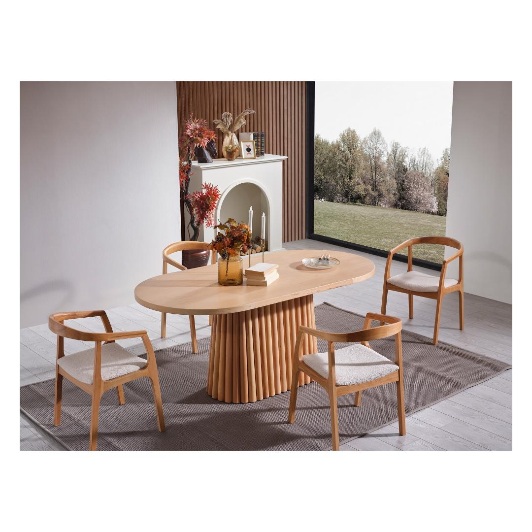 Muuda oma söögituba elegantseks ja elegantseks ruumiks meie uimastava söögilauaga. See 100% mdf-puidust valmistatud ja naturaalse pöögipuiduga kaetud laud kiirgab soojust ja võlu, mis tõstab teie kodu sisekujundust koheselt esile. Kerge disain ja puhtad jooned muudavad selle mitmekülgseks tükiks, mis täiendab mis tahes stiilis söögitoole.