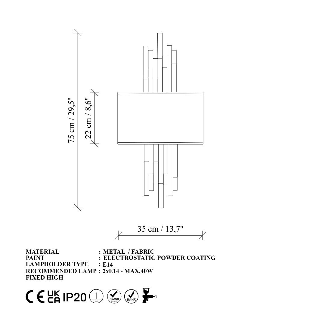 Detailidele tähelepanu pöörates valmistatud seinalamp on loodud kestma ja taluma ajaproovile. Metallkorpus tagab vastupidavuse, samas kui kangast kate lisab pehmust ja elegantsi. Suurusega 35 x 75 x 10 cm ja katte suurusega 35 x 21 x 10 cm on see lamp ideaalne suurus igale seinale teie kodus.