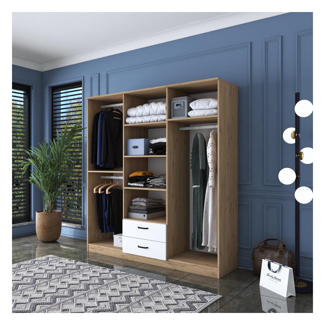 Ütle hüvasti segadusele ja tere korraldusele! meie garderoobis on arvukalt riiuleid, mis võimaldavad sul oma riideid, aksessuaare ja asju kenasti paigutada. Tänu oma avarale disainile ei pea te enam kunagi muretsema, et hoiuruum hakkab otsa saama.