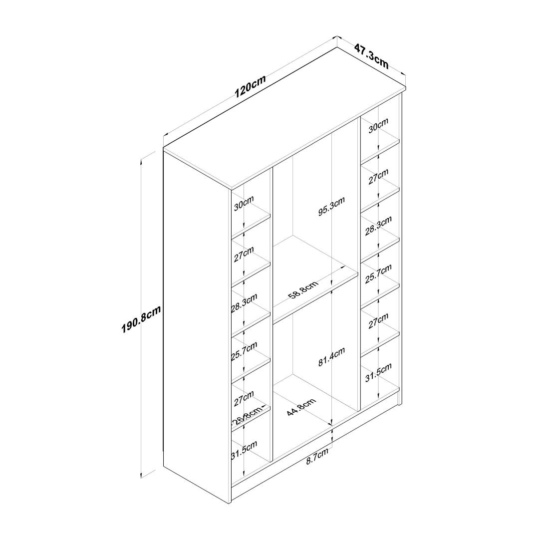 Suurepäraste mõõtmetega, mille laius on 120 cm, 190. 8 cm kõrgus ja 47. 3 cm sügavus, pakub see riidekapp piisavalt ruumi kõigi teie riiete ja aksessuaaride jaoks. Arvukad riiulid tagavad mugava organiseerimise, mis võimaldab teil hoida oma asju korrastatult ja hõlpsasti kättesaadavana.