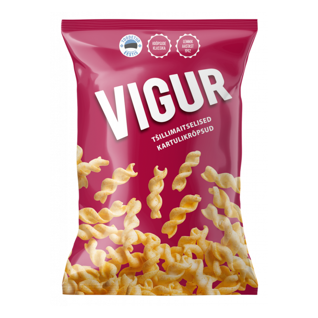Tšillimaitselised kartulikrõpsud. Välimus Kollakad spiraalikujulised krõpsud, kaetud punakaoranži maitseaineseguga Tekstuur Krõbe Maitse ja lõhn Maitse ja lõhn iseloomulik rapsiõlis praetud kartulitootele, tunda tšillist maitset, kõrvalmaitse ja kõrvallõhnata. Ettevõttes käideldakse tooteid, mis võivad sisaldada gluteeni, pähkleid, maapähklit, seesamiseemneid, sojatooteid, sellerit, sinepit, piimatooteid, vääveldioksiidi ja sulfiteid. Koostisosad: 34,5 % (kartulitärklis, kartuligraanulid), rapsiõli, lõhna- ja maitseained, maltodekstriin, suhkur, sool, toiduvärv paprika ekstrakt, antioksüdant alfa-tokoferool.