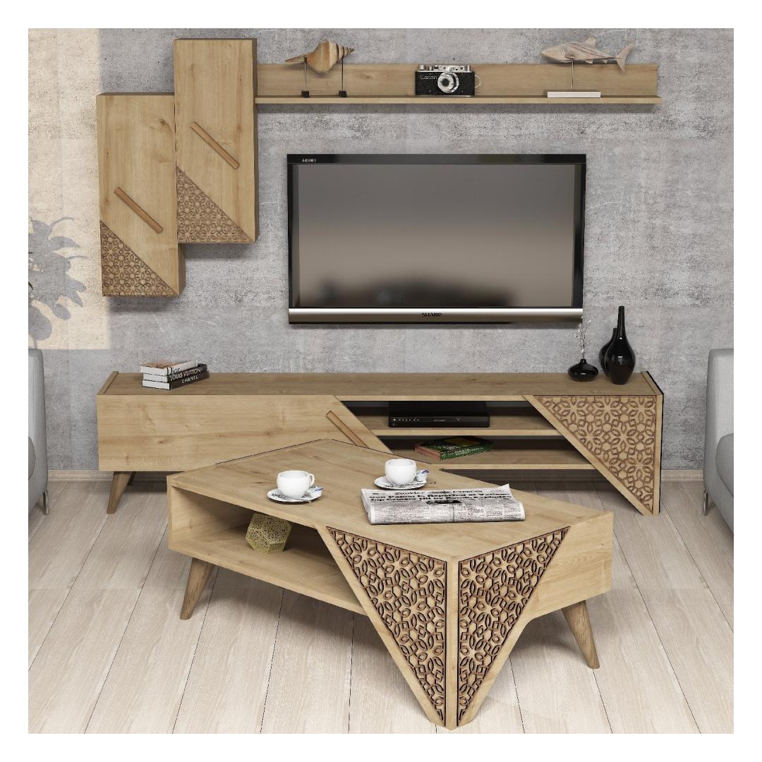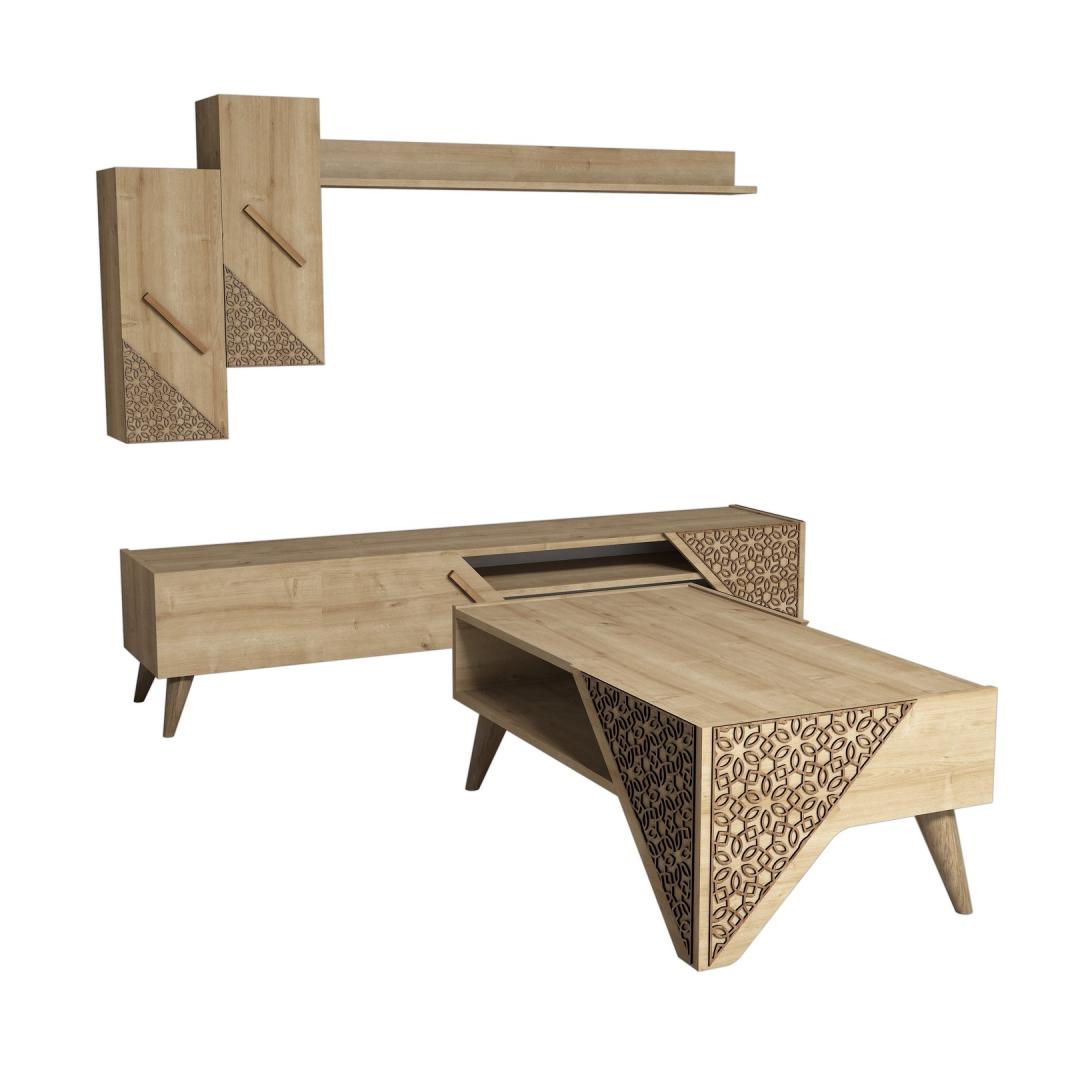 TV-üksus, 2-tasandiline kohvilaud, seinaleht ja kapp on loodud selleks, et täiustada teie elutoa sisustust modernse ja uuendusliku kontseptsiooniga. Avatud riiulid pakuvad piisavalt ruumi teie oluliste asjade jaoks, hoides teie ruumi organiseerituna ja segaduseta. Tamme värv lisab teie koju soojust ja võlu, luues külalislahke atmosfääri teile ja teie külalistele.