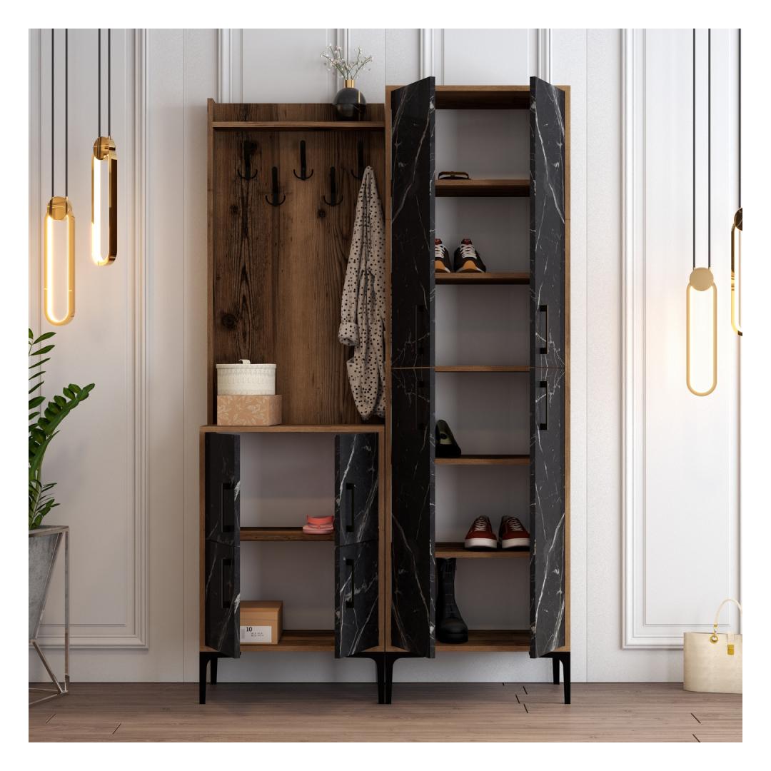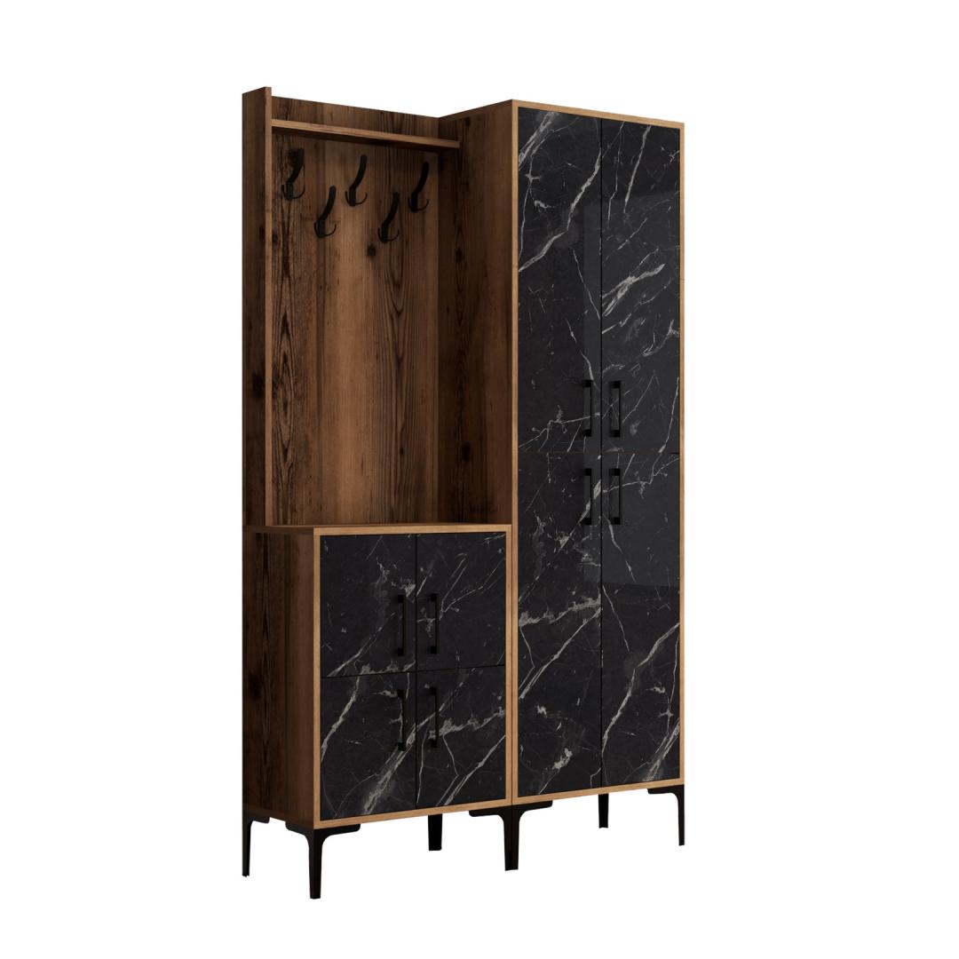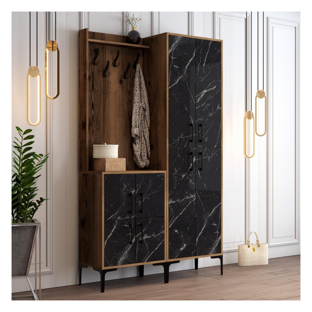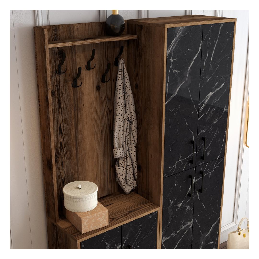 Muutke oma koridor stiilseks ja funktsionaalseks ruumiks meie koridoristendiga!Looge oma koju soe ja kutsuv atmosfäär selle suurepärase mööbliesemega. Valmistatud 100% melamiiniga kaetud puitlaastplaadist, ei ole see koridoristend mitte ainult vastupidav, vaid ka hõlpsasti puhastatav ja hooldatav. Tõstke oma esikusse elegantsiTänu oma elegantsele disainile ja tööstuslikule kontseptsioonile lisab see koridoristend teie koridorile koheselt elegantsust. Pähklipuu ja musta värvi kombinatsioon annab sellele kaasaegse ja stiilse välimuse, mis täiendab mis tahes sisekujundust.Püsige organiseerituna rohkete hoiuvõimalustegaMitmete riiulite ja rippuva mantlihoidja abil pakub see koridori stend piisavalt ruumi mantlite, mütside, kottide ja muude oluliste esemete hoidmiseks. Ütle hüvasti segastele koridoridele ja tere hästi organiseeritud ja korrastatud ruumile. Maksimeerida oma ruumi seinale paigaldatava disainigaSeda koridori statiivi saab hõlpsasti seinale kinnitada, mis võimaldab teil kasutada olemasolevat ruumi maksimaalselt ära. Olenemata sellest, kas teil on väike koridor või avar esikus, aitab see seinale paigaldatav disain optimeerida teie ruumi, ilma et teeksite kompromisse stiili osas. Tehnilised üksikasjad:Materjal: Materjal: Materjal: Materjal: Materjal: Materjal: Materjal: Materjal: materjal: 100% melamiiniga kaetud puitlaastplaatPaksus: 18 mmMetallist jalg, metallist käepide, metallist riputusklamberLaius: 120 cm, kõrgus: 200 cm, sügavus: 35 cm.Värv: pähkelpuu ja mustVajutage oma koridor juba täna ja kogege meie koridoripuldi abil stiili ja funktsionaalsuse täiuslikku kombinatsiooni. Tellige kohe ja muutke oma ruum sõbralikuks ja korrastatud ruumiks, mida saate uhkusega oma külalistele näidata! Värv: Walnut Black