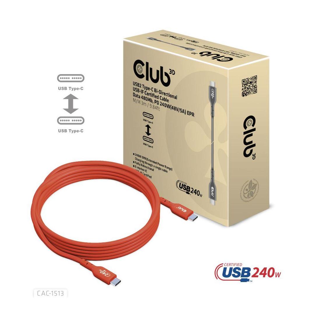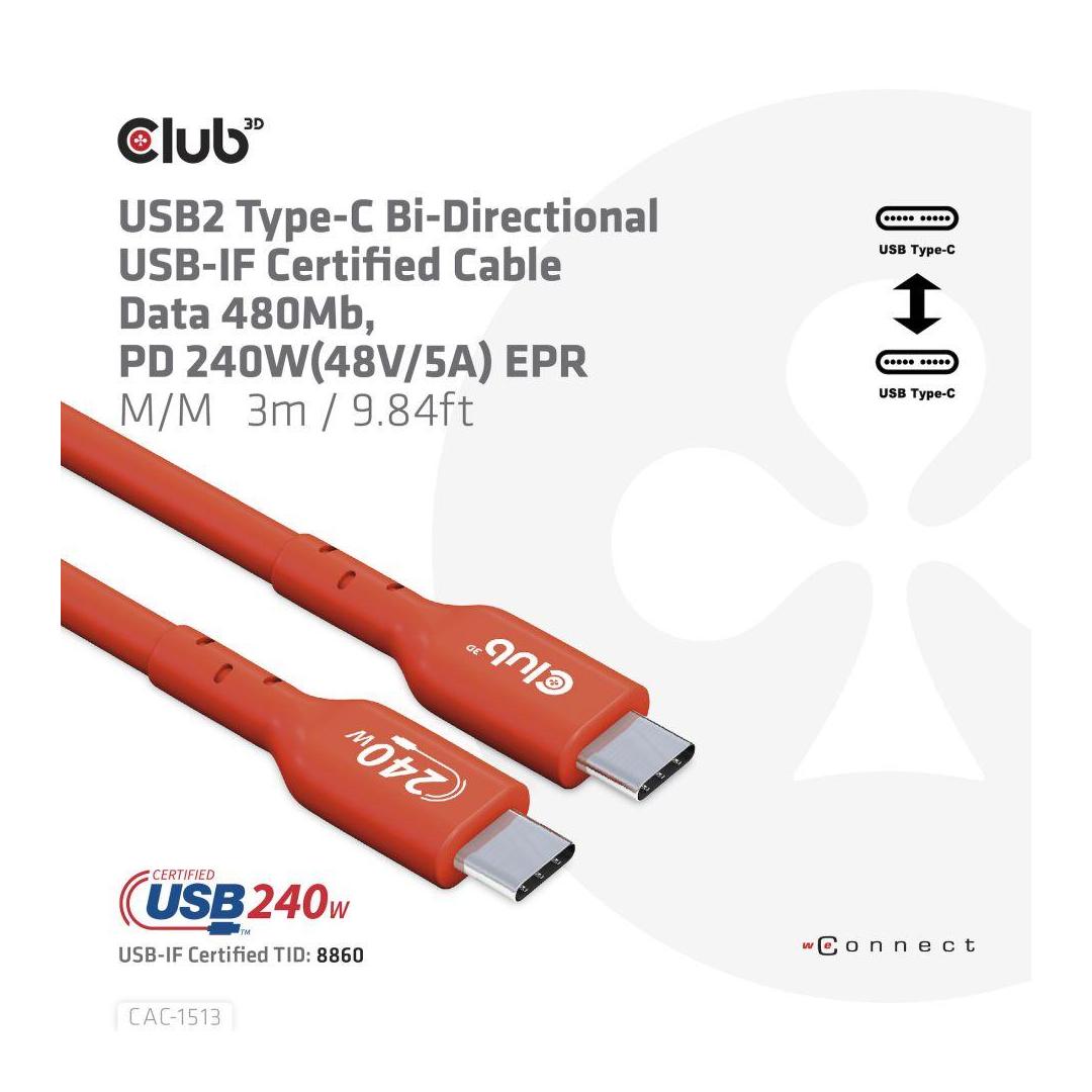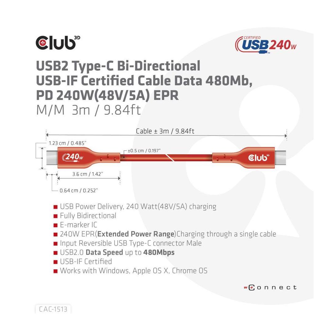 The Club 3D CAC-1513 USB2.0 Type-C Bi-Directional USB-IF Certified Cable, Data 480Mb, PD 240W(48V/5A) EPR, Extended Power Range M/M 3m / 9.84 ft connects your Notebook, Tablet or Phone with USB Type-C output to your favorite existing Peripherals, Accessories and Chargers. It enables Data and Power over a single cable and both ways. This cable supports USB2.0 data up to 480Mbps and up to 240Watt(48V/5A) output for Downstream charging or powering your Notebook, Tablet or Smartphone.