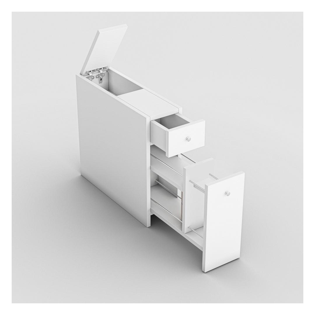 Kaks sahtlit, arvukad riiulid ja alumine sahtel lisaruumi jaoks pakuvad piisavalt ruumi kõigile teie vannitoa tarvikutele. Telescopilised sahtli liugurid tagavad sujuva ja vaikse toimimise, samas kui täielikult kokkupandud disain muudab selle kohe kasutamiseks valmis.