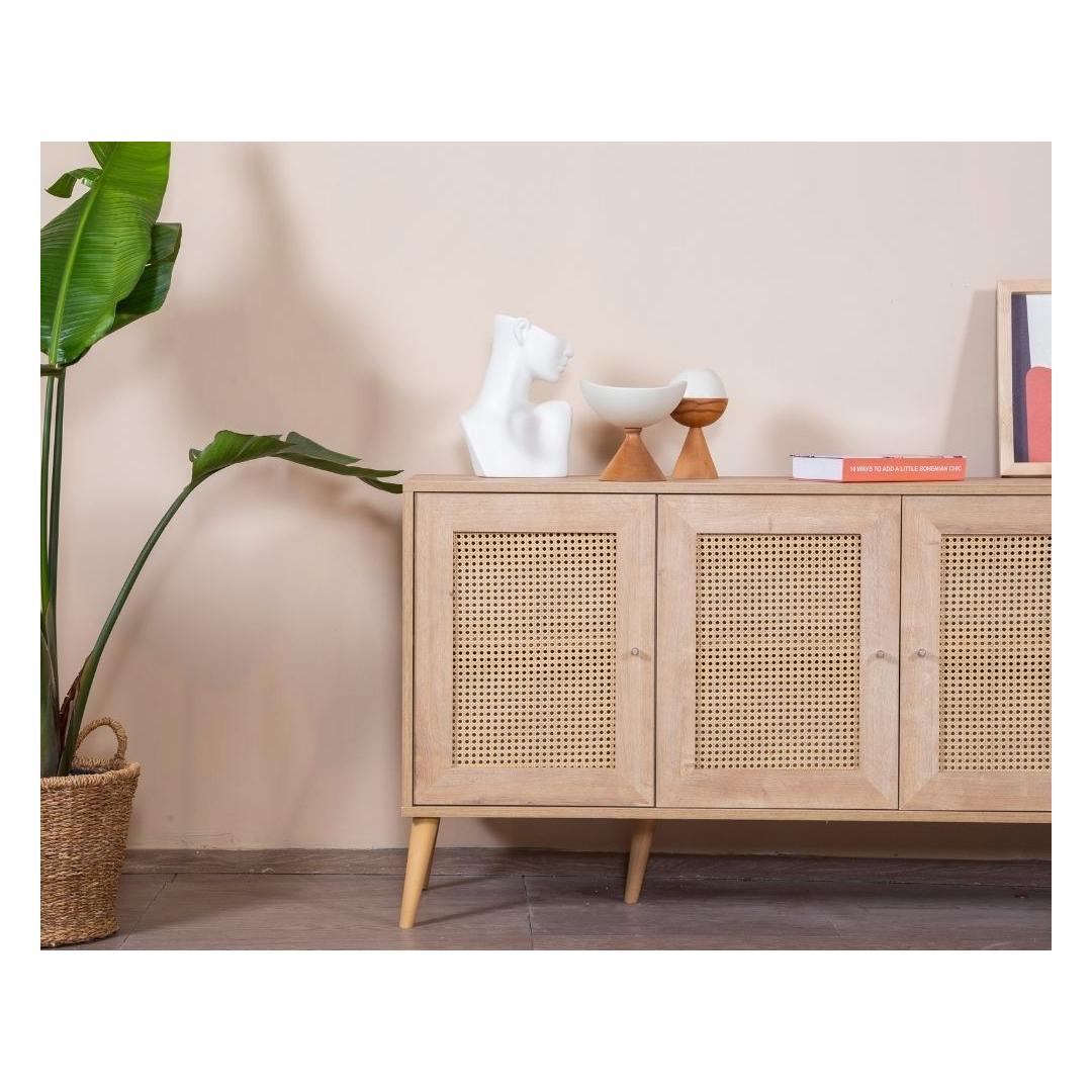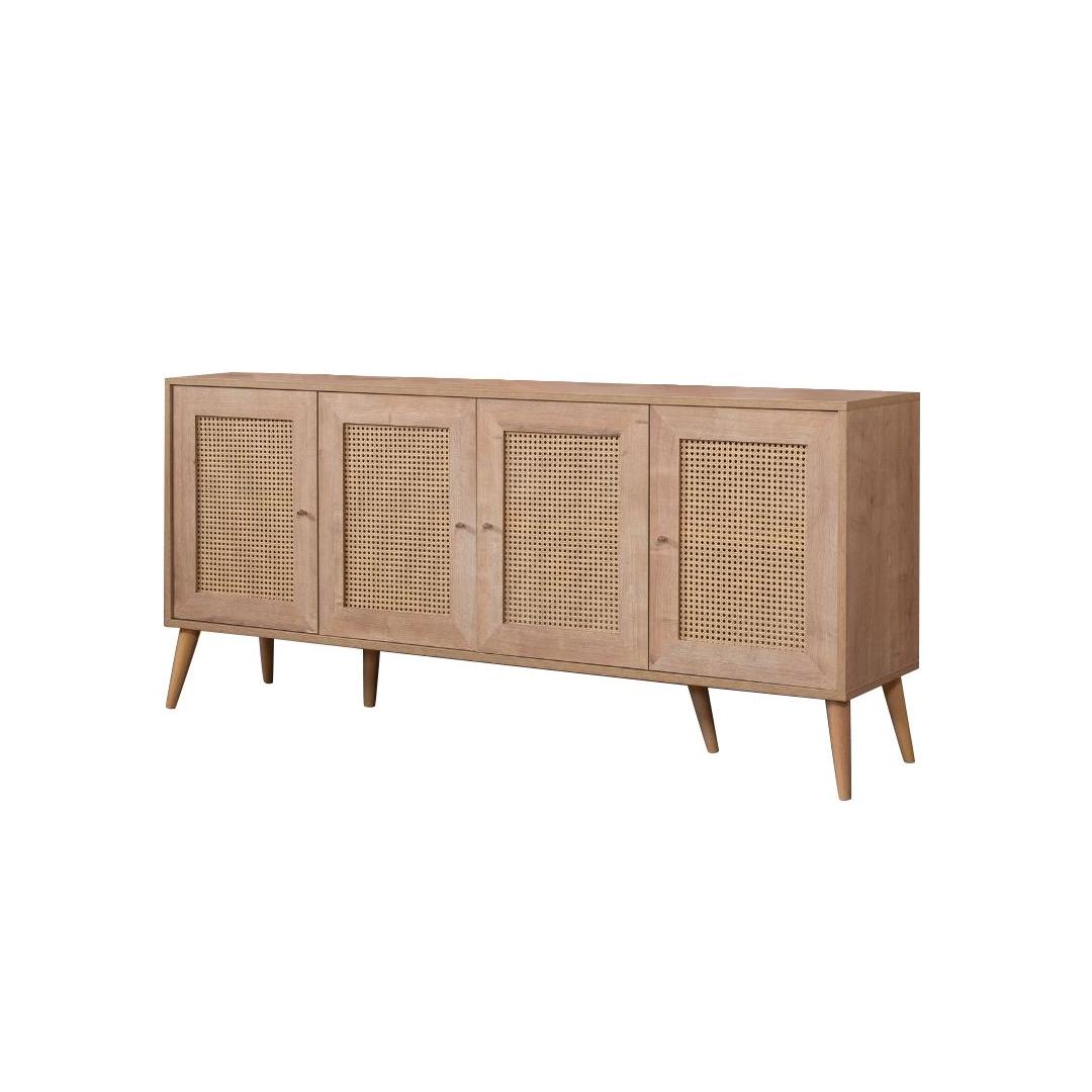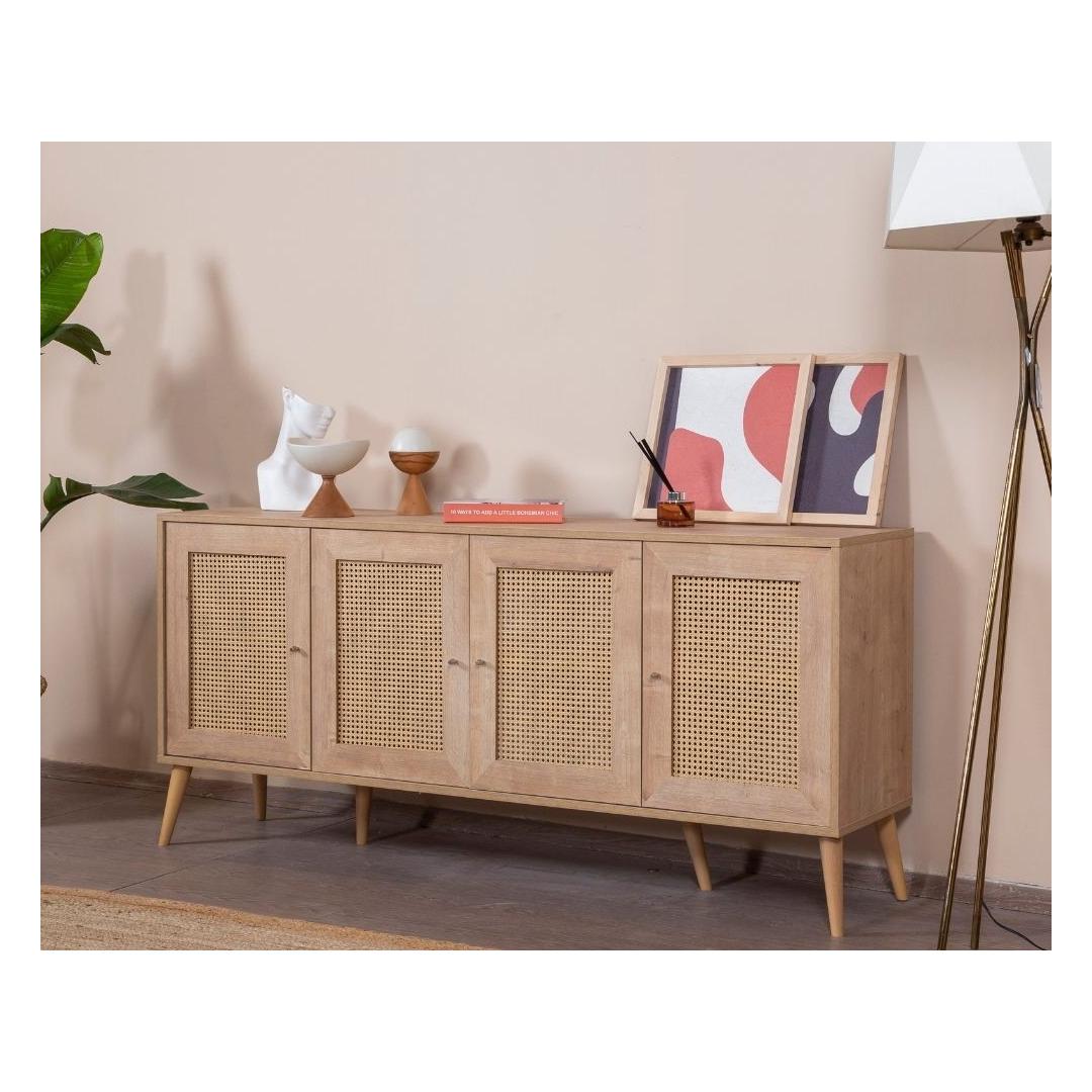 Konsoolil on 100% melamiinkattega puitlaastplaadist korpus ja 100% MDF-ust, mis tagab vastupidavuse ja pikaealisuse. Laius on 180 cm, kõrgus 80 cm ja sügavus 41 cm, pakkudes piisavalt hoiuruumi kõigi sinu oluliste asjade jaoks. Rohked riiulid pakuvad mugavaid hoiustamisvõimalusi, samas kui pehmelt sulguvad uksed lisavad disainile luksuslikku puudutust.