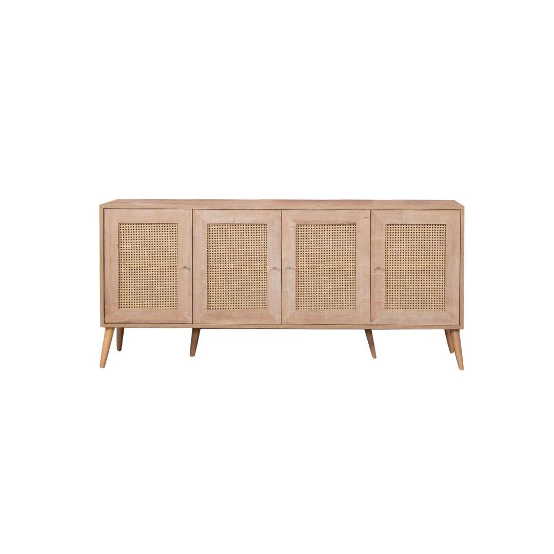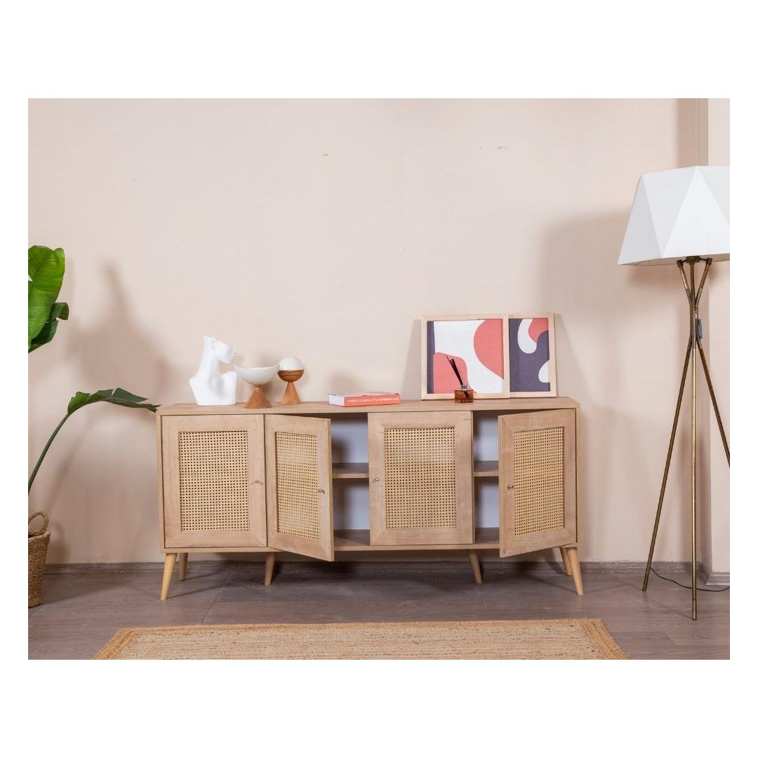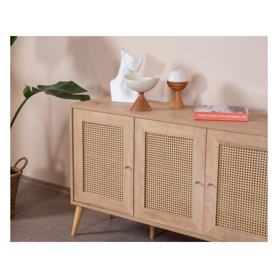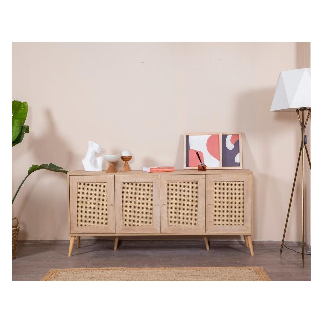 Konsoolil on 100% melamiinkattega puitlaastplaadist korpus ja 100% MDF-ust, mis tagab vastupidavuse ja pikaealisuse. Laius on 180 cm, kõrgus 80 cm ja sügavus 41 cm, pakkudes piisavalt hoiuruumi kõigi sinu oluliste asjade jaoks. Rohked riiulid pakuvad mugavaid hoiustamisvõimalusi, samas kui pehmelt sulguvad uksed lisavad disainile luksuslikku puudutust.