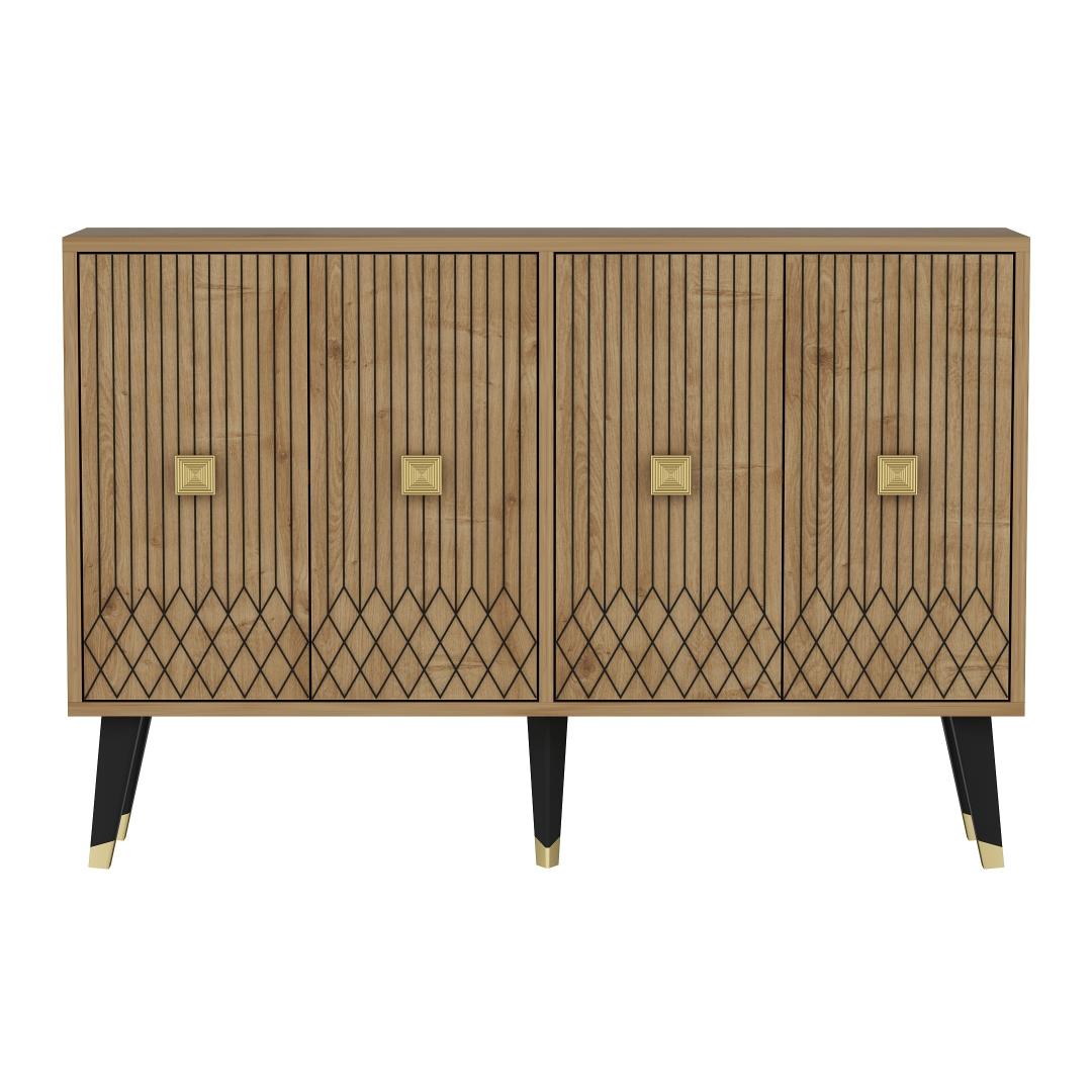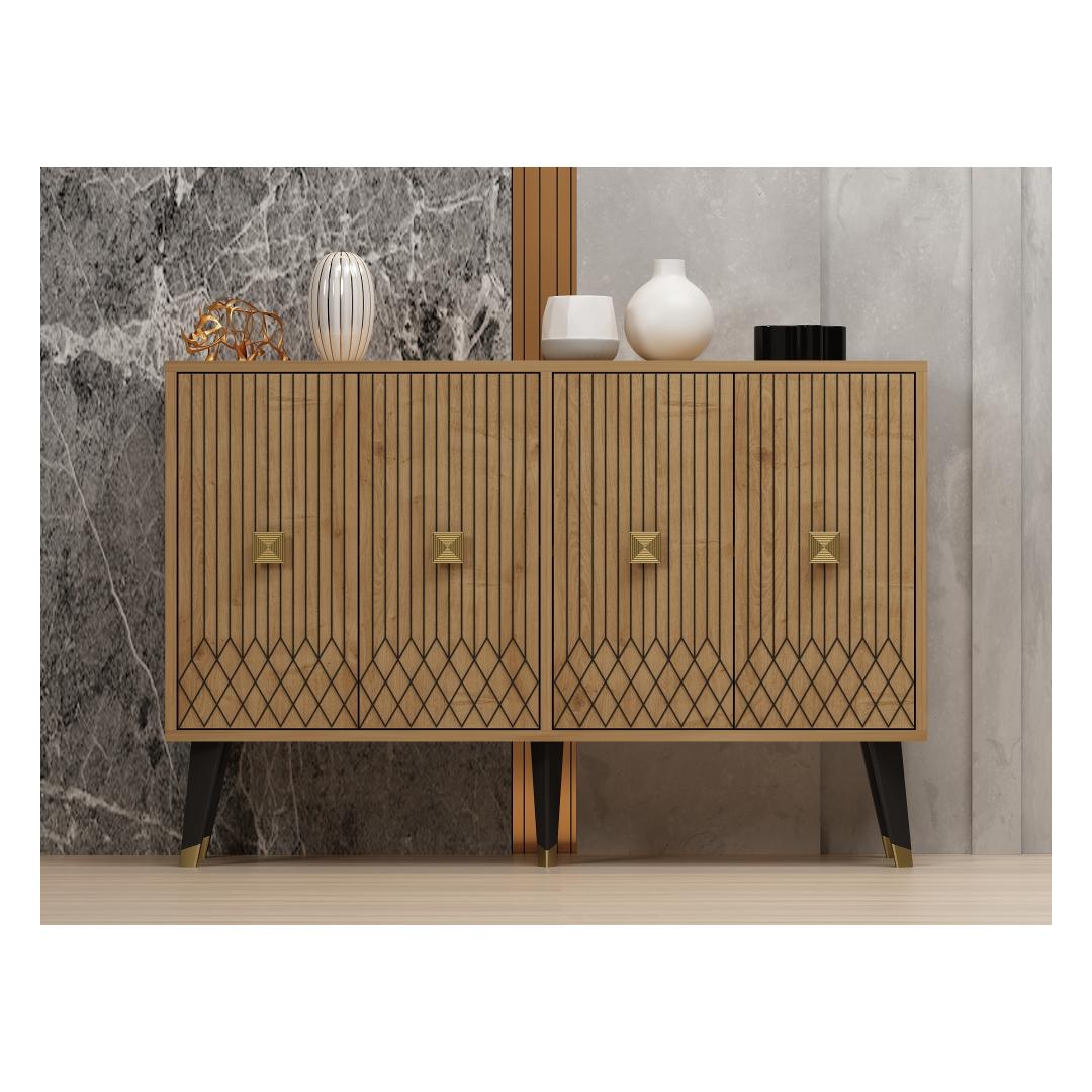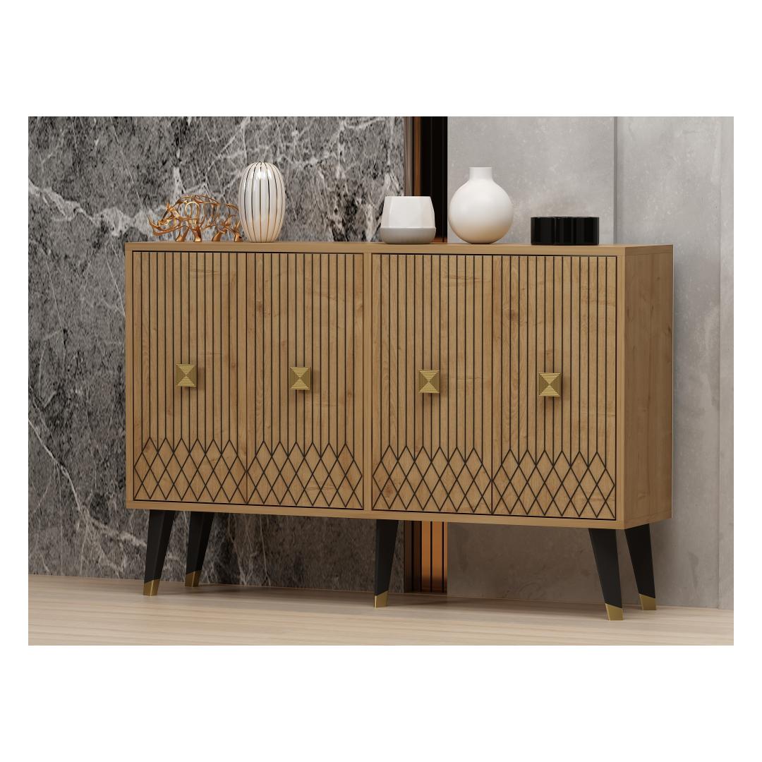 Tutvustame konsooli - uimastavat mööblit, mis muudab teie eluruumi elegantse ja stiilse õhkkonna. Tänu oma elegantsele disainile ja laitmatule käsitööle on see konsool ideaalne täiendus igasse koju. Tõstke oma ruumiKujutage ette, et astute oma elutuppa ja teid tervitab konsooli peen ilu. Selle safiiritamme ja kuldne värvikombinatsioon õhkab rafineeritust ja luksust, tõstes koheselt teie ruumi atmosfääri. Olenemata sellest, kas paigutate selle oma esikusse, elutuppa või magamistuppa, muutub see konsool teie sisustuse keskpunktiks, jättes külalised aukartusse.Võrratu kvaliteetÄärmiselt täpselt valmistatud konsool on valmistatud 100% melamiiniga kaetud puitlaastplaadist. See tagab selle vastupidavuse ja pikaealisuse, mis võimaldab teil nautida selle ilu aastaid. Plaadi 18 mm paksus lisab sellele vastupidavust, muutes selle usaldusväärseks mööbliesemeks, mis peab vastu igapäevasele kasutamisele. Monitoorne ja funktsionaalneKonsool mitte ainult ei täiusta teie kodu esteetikat, vaid pakub ka praktilisust. Tänu 120 cm laiusele, 80 cm kõrgusele ja 30 cm sügavusele pakub see piisavalt ruumi, et esitleda oma lemmikdekoratsiooni esemeid, hoida esmatarbeid või kasutada seda isegi stiilse tööpinnana. Tänu mitmekülgsusele on see garderoob kohustuslik neile, kes hindavad nii ilu kui ka funktsionaalsust. Tehnilised üksikasjad:Materjal: Materjal: Materjal: Materjal: Materjal: Materjal: Materjal: Materjal: materjal: 100% melamiiniga kaetud puitlaastplaatPaksus: 18mmLaius: 120cmKõrgus: 80cmSügavus: 30cmVärv: Sapphire Oak ja GoldUuendage oma kodu konsooliga ja kogege elegantsi ja funktsionaalsuse täiuslikku segu. Tellige kohe ja laske sellel peenel mööbliesemel muuta oma eluruum stiilipäraseks pühapaigaks. Värv: Sapphire Oak Gold