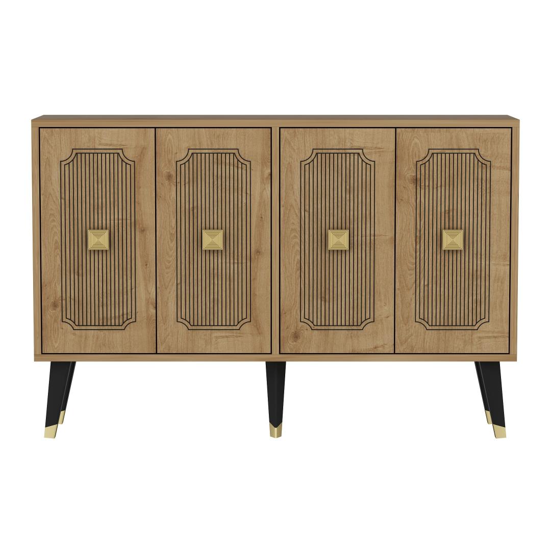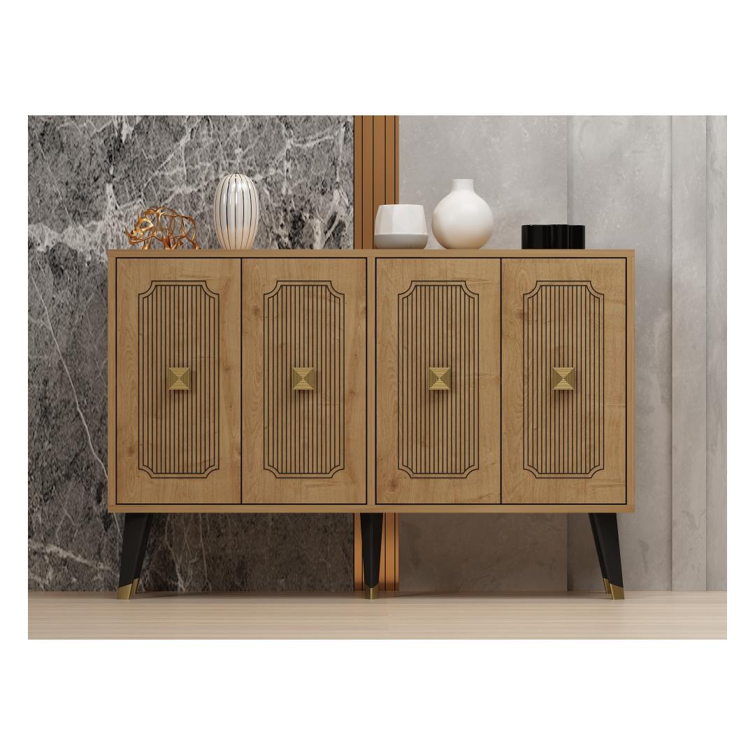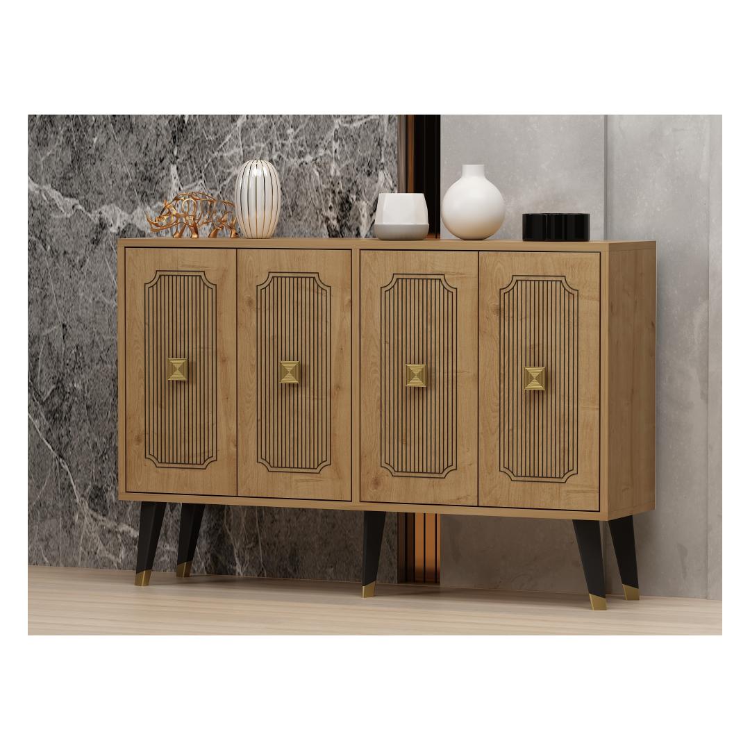 Tutvustame konsooli - uimastavat mööblit, mis muudab teie eluruumi elegantse ja stiilse õhkkonna. Tänu oma elegantsele disainile ja laitmatule käsitööle on see konsool ideaalne täiendus igasse koju. Tõstke oma ruumiKujutage ette, et astute oma elutuppa ja teid tervitab konsooli peen ilu. Selle safiiritamme ja kuldne värvikombinatsioon õhkab rafineeritust ja luksust, tõstes koheselt teie ruumi atmosfääri. Olenemata sellest, kas paigutate selle oma esikusse, elutuppa või magamistuppa, muutub see konsool teie sisustuse keskpunktiks, jättes külalised aukartusse.Võrratu kvaliteetÄärmiselt täpselt valmistatud konsool on valmistatud 100% melamiiniga kaetud puitlaastplaadist. See tagab selle vastupidavuse ja pikaealisuse, mis võimaldab teil nautida selle ilu aastaid. Plaadi 18 mm paksus lisab sellele vastupidavust, muutes selle usaldusväärseks mööbliesemeks, mis peab vastu igapäevasele kasutamisele. Monitoorne ja funktsionaalneKonsool mitte ainult ei täiusta teie kodu esteetikat, vaid pakub ka praktilisust. Tänu 120 cm laiusele, 80 cm kõrgusele ja 30 cm sügavusele pakub see piisavalt ruumi, et esitleda oma lemmikdekoratsiooni esemeid, hoida esmatarbeid või kasutada seda isegi stiilse tööpinnana. Tänu mitmekülgsusele on see garderoob kohustuslik neile, kes hindavad nii ilu kui ka funktsionaalsust. Tehnilised üksikasjad:Materjal: Materjal: Materjal: Materjal: Materjal: Materjal: Materjal: Materjal: materjal: 100% melamiiniga kaetud puitlaastplaatPaksus: 18mmLaius: 120cmKõrgus: 80cmSügavus: 30cmVärv: Sapphire Oak ja GoldUuendage oma kodu konsooliga ja kogege elegantsi ja funktsionaalsuse täiuslikku segu. Tellige kohe ja laske sellel peenel mööbliesemel muuta oma eluruum stiilipäraseks pühapaigaks. Värv: Sapphire Oak Gold