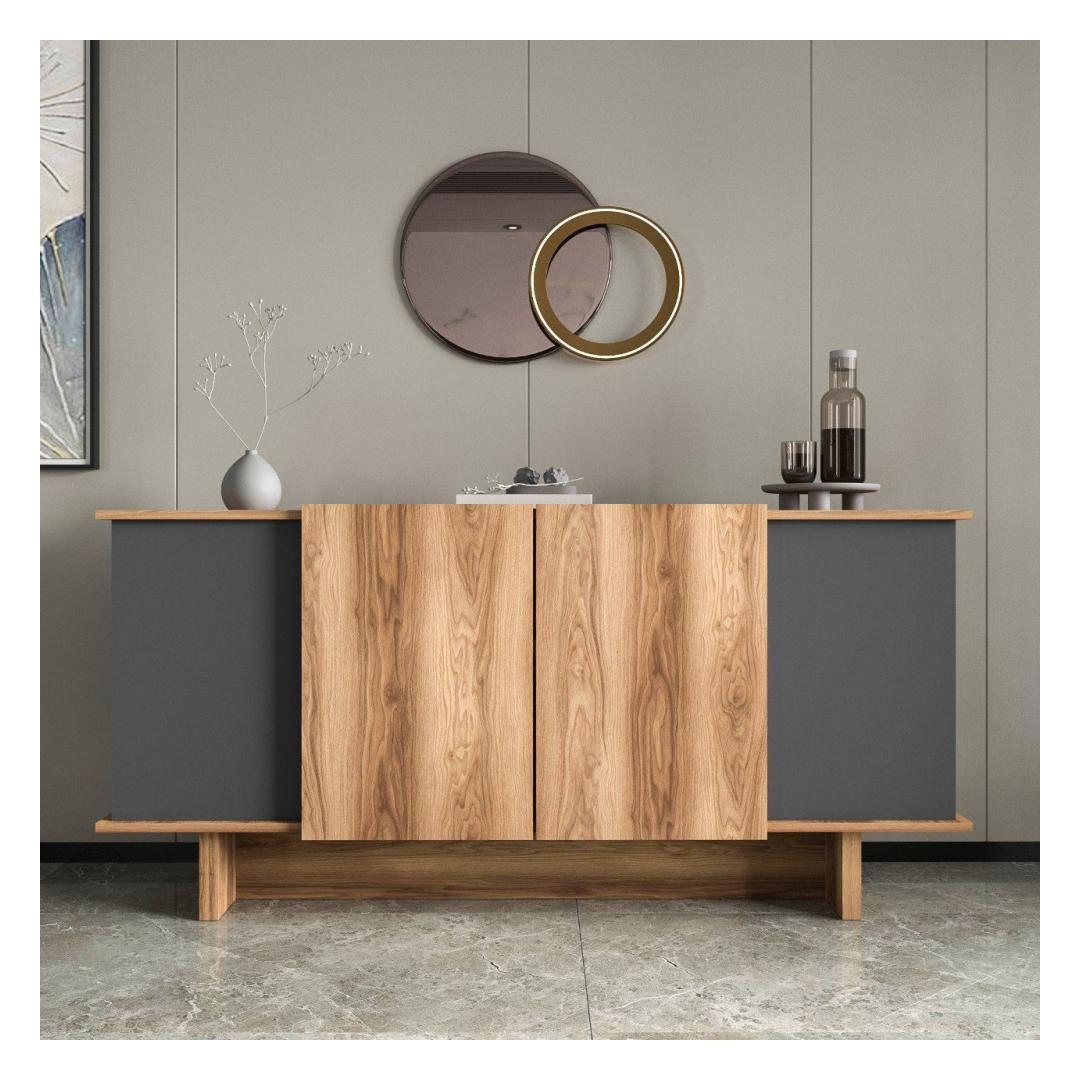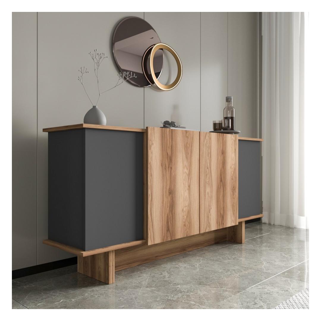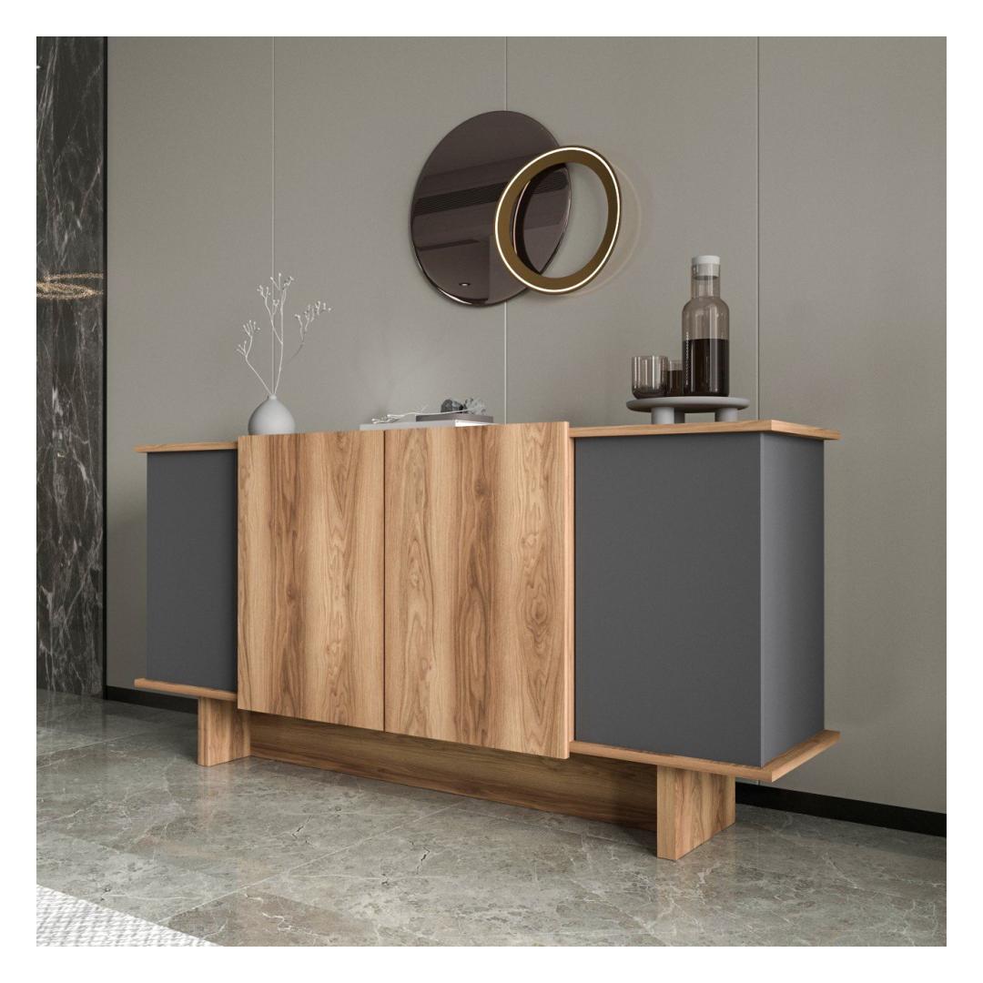 Muuda oma eluruum meie uimastava konsooliga, mis on valmistatud 100% melamiiniga kaetud puitlaastplaadist. Stiilne disain ning antratsiidi ja pähklipuu kaasaegne värvikombinatsioon tõstavad koheselt iga ruumi stiili.