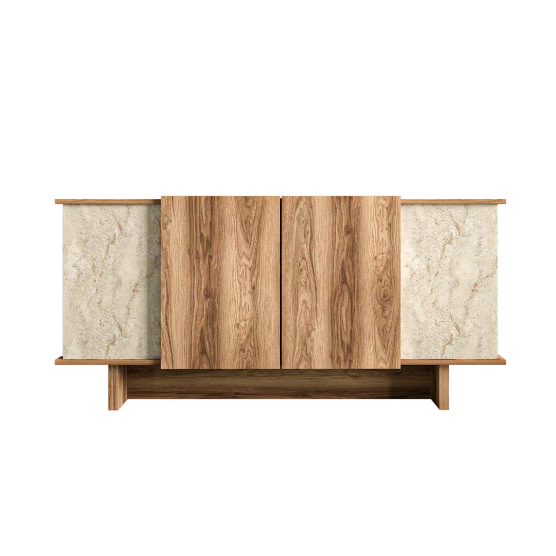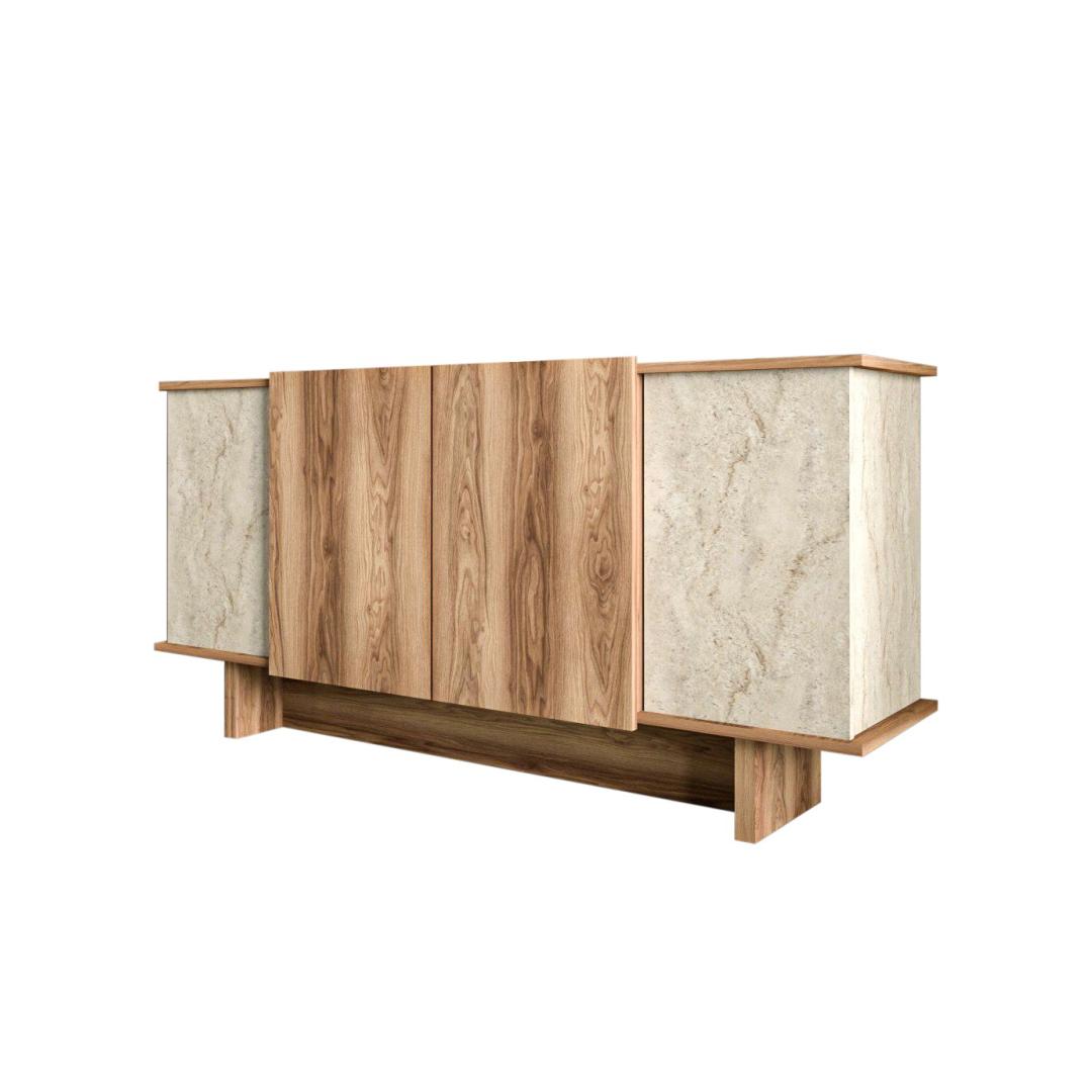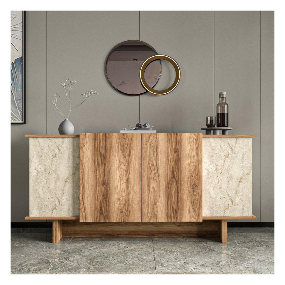 Muuda oma eluruum meie uimastava konsooliga, mis on valmistatud 100% melamiiniga kaetud puitlaastplaadist, mis tagab vastupidavuse ja stiili. Kerge disain ja travertiini ja pähklipuu elegantne värvikombinatsioon tõstavad koheselt teie kodu mis tahes ruumi.