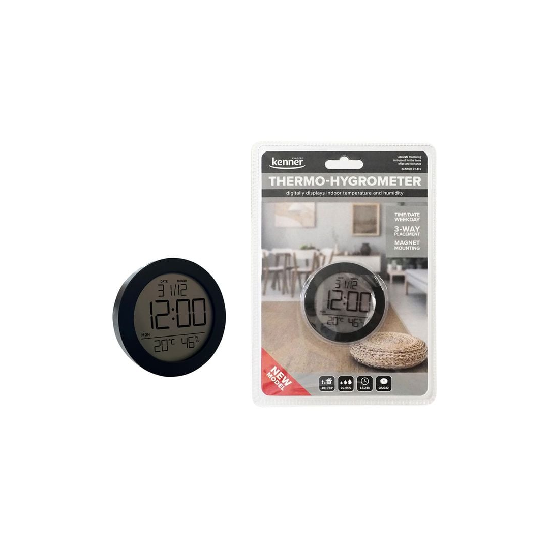 Täpse digitaalnäidikuga sisetermomeeter (Celsius ja Fahrenheit) ja hügromeeter (RH % õhuniiskus) koju, kontorisse või töökotta.