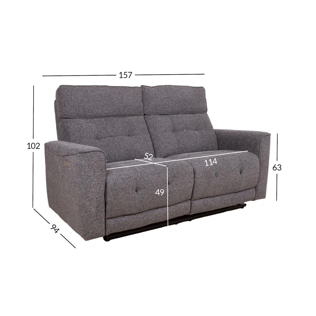 Diivani üldmõõdud on 157x94xH102cm. Istme laius 114cm, istme sügavus 52cm, istme kõrgus 49cm. Käetoe kõrgus maast 63cm. Diivan BOSCO 2-kohaline elektriline recliner, hall.