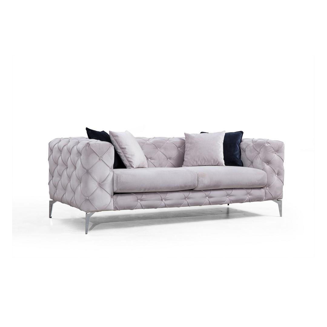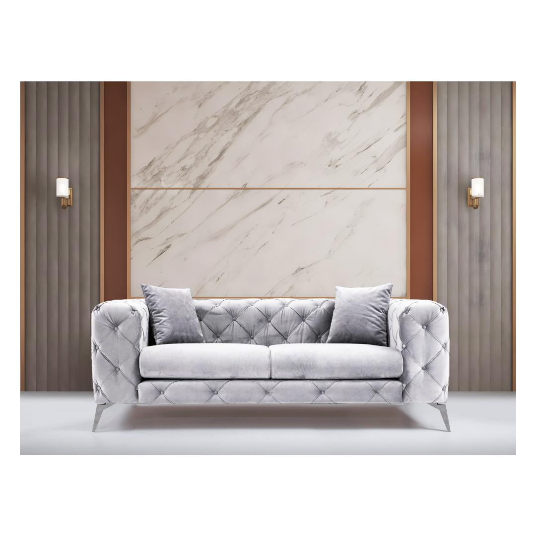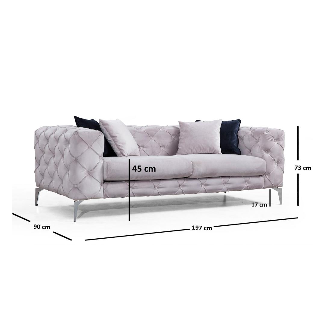 Koge võrratut mugavust ja stiili meie 2-kohalise diivanigaMuutke oma eluruum lõõgastumise ja elegantsi paradiisiks meie 2-istmelise diivaniga. See diivan on valmistatud ülima hoole ja tähelepanuga detailidele ning on loodud selleks, et pakkuda teile võrratut istumiskogemust. Lõbutsege puhtas õndsusesVajutage meie diivani pehmete padjadesse ja tundke, kuidas päevane stress ära sulab. 5 cm 28 dns hall vahtpolster ja 5 cm 24 dns sulged istumiseks tagavad optimaalse mugavuse, samas kui 24 dns sulgedega seljatugi pakub suurepärast tuge. Nelja kaasasoleva padjaga saate kohandada istumisvõimalusi vastavalt oma eelistustele.Võrratu kvaliteet ja vastupidavusMeie diivan on ehitatud kestma. Raam on valmistatud tugevast pöögipuidust ja puitlaastplaadist, mis tagab pikaajalise vastupidavuse. 100% polüesterkangas ei ole mitte ainult pehme, vaid ka kuivpuhastatav, mistõttu on lihtne säilitada selle laitmatut välimust. Tõstke oma elutubaOma elegantsete kroomitud metalljalgade ja soliidse helehalli värviga sulandub meie diivan vaevata igasse moodsasse või glamuursesse interjööri. Kompaktne suurus 197 cm laius, 73 cm kõrgus ja 90 cm sügavus muudab selle ideaalselt sobivaks väiksematesse ruumidesse, tegemata kompromisse stiili või mugavuse osas. Tehnilised üksikasjad:Raam: Puit: Pöögipuit / puitlaastplaatKangas: Materjal: 100% polüesterVaht: 5 cm 28 DNS hall vaht + 5 cm 24 DNS sulega istumiseks, 24 DNS sulega seljatoele.4 padjakest lisatud% 60 % vahtpolster / % 40 % silikoonvaht.Padja suurus: 45 cm x 45 cmKaasaskantav istumispadi, fikseeritud seljapadiKuivpuhastatav kangasJalad: Kroomitud metallist jaladVahu kõrgus: 16 cmVärv: helehallKogege ülimat mugavust ja stiili meie 2-istmelise diivaniga. Uuendage oma eluruumi juba täna ja anduge puhtale luksusele. Värv: Light Grey