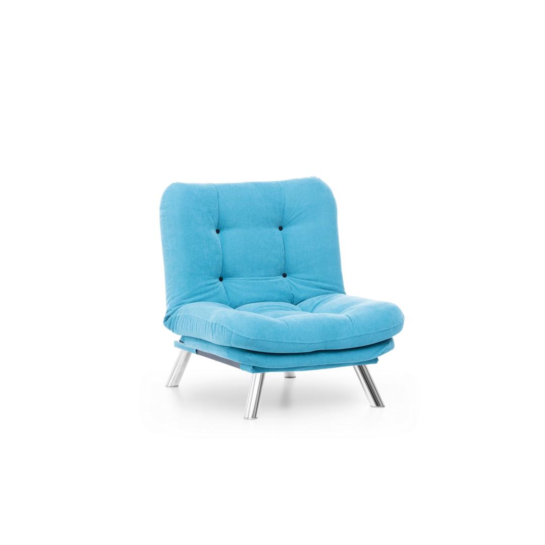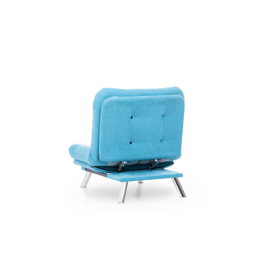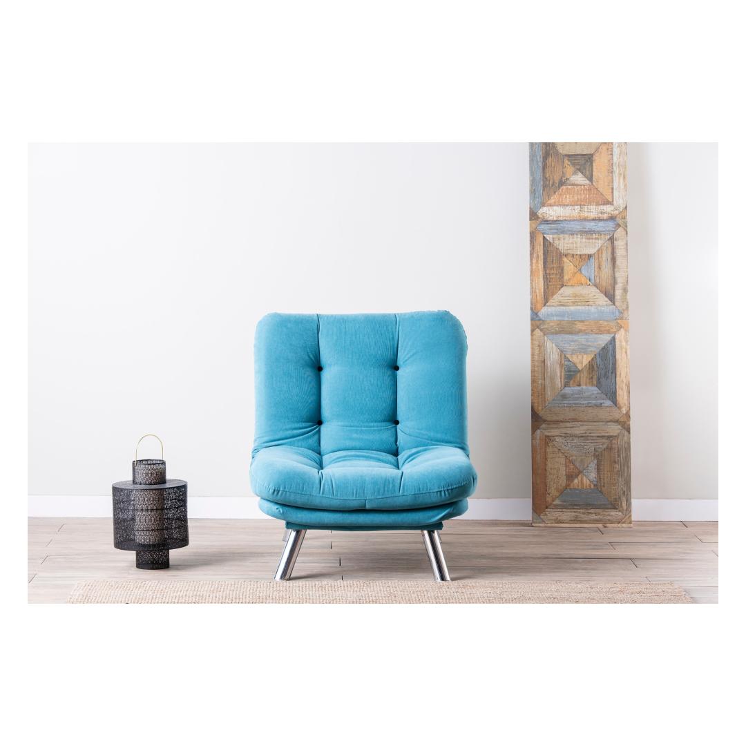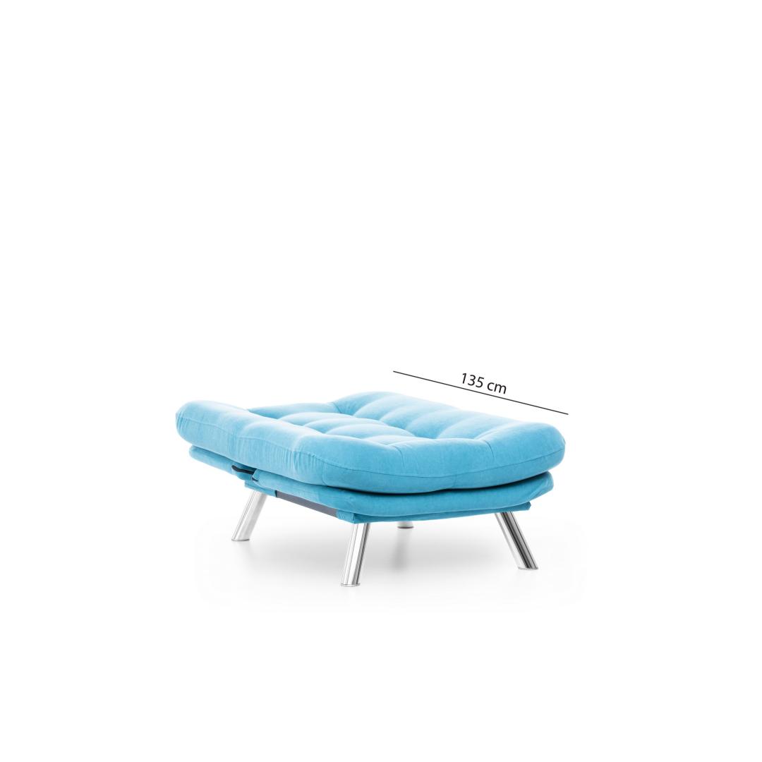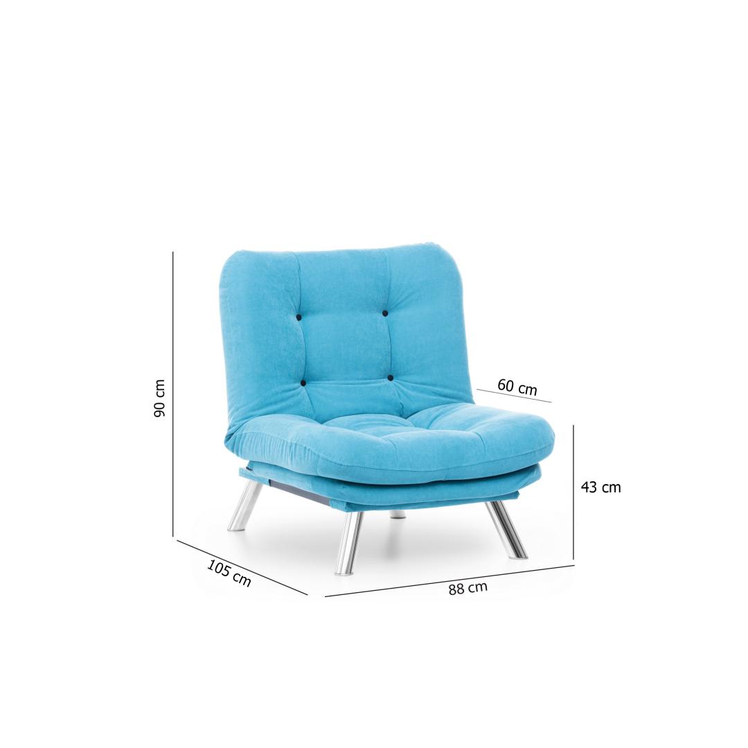 Muuda oma eluruum meie hämmastava 1-kohalise diivani abil, mis on lummavas türkiissinises värvitoonis. See mööbliese ei ole lihtsalt diivan, vaid stiili ja mugavuse väljendus, mis tõstab iga ruumi atmosfääri.Ületamatu Mugavus ja KvaliteetValmistatud 100% metallraamist ja pehmest kangast, on see diivan loodud maksimaalse mugavuse ja vastupidavuse tagamiseks. 400 gr/m² silikoonkiud täidis tagab luksusliku istumiskogemuse, samas kui 25 DNS vaht+kiud kattekiht toetab teie selga ja istet.Šikk ja Mitmekülgne DisainSelle diivani sujuv disain kindlas türkiissinises värvitoonis lisab teie ruumile elegantsi. Kompaktne suurus teeb selle ideaalseks väikestesse elutubadesse, magamistubadesse või isegi kodukontoritesse.Kergesti HooldatavÜtle hüvasti koristamise vaevadele meie kergesti puhastatava kangaga. Lihtsalt pühkige ära tilgad ja plekid, et diivan näeks iga päev välja nagu uus.Tõsta oma kodu sisustus meie 1-kohalise diivani abil ja koge stiili, mugavuse ja kvaliteedi täiuslikku segu. Tellige nüüd ja muuda oma ruum lõõgastumise ja rafineerituse pelgupaigaks.Tehnilised Andmed:Raam: 100% METALLKangas: 100% PEHME KANGASLaius: 88 cm, Kõrgus: 90 cm, Sügavus: 105 cmIste Sügavus: 60 cm, Iste Laius: 80 cm, Iste Kõrgus: 42 cmVoodi Suurus: Laius: 135 cm, Sügavus: 88 cm400 gr/m² silikoonkiud täidis25 DNS vaht+kiud kattekiht istumiseks25 DNS vaht+kiud kattekiht seljatoeksJala Kõrgus: 21 cmMaksimaalne Kandevõime: 100 kgMetall / Kroomitud Jalgade KattekihtVärv: Türkiissinine Värv: Turquoise
