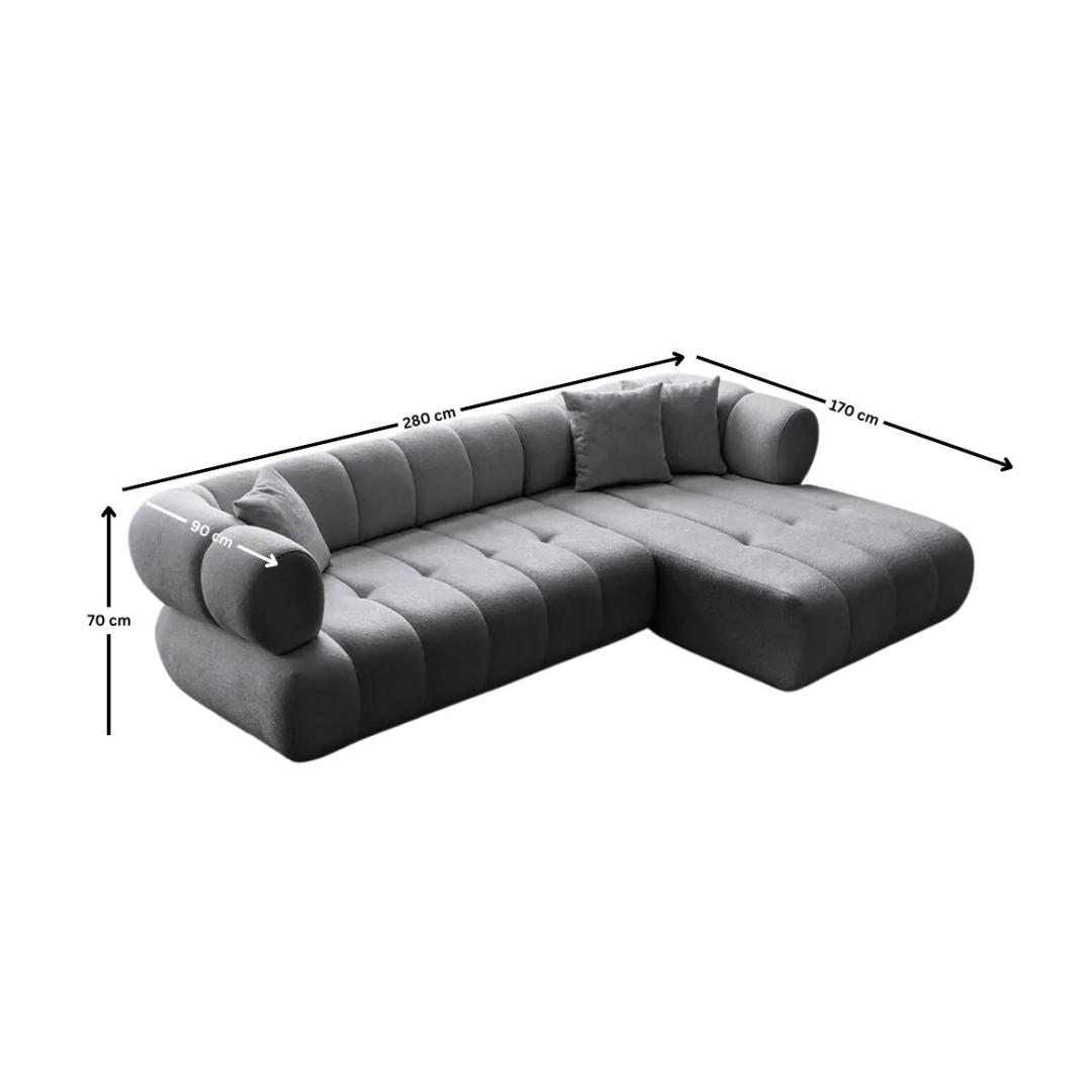 Muuda oma eluruum meie kauni tumehalliga nurgadiivaniga. See elegantne mööbliese lisab sinu koju mitte ainult rafineerituse, vaid pakub ka maksimaalset mugavust, mida sa väärid.Luksuslik MugavusLangeta end pehmetesse 32 DNS vahtkummist padjadesse ja lõõgastu pärast pikka päeva. Liikuv seljatoepadi võimaldab sul kohandada oma istumiskogemust, samas kui avarad mõõtmed tagavad piisavalt ruumi sinu ja sinu lähedaste lõõgastumiseks.Stiilne DisainValmistatud vastupidavast raamistikust, mis koosneb 70% HORNBEAM'ist ja 30% MELAMIINI KAETUD PUITLASTUST, on see diivan loodud kestma. Šikk tumehall kangas Boucle tekstuuriga lisab igasse ruumi modernset elegantsi, samas kui plastjalad tagavad stabiilsuse ja toe.Kergesti HooldatavÜtle hüvasti tundidepikkusele koristamisele - meie Easy-Clean kangas muudab hooldamise lihtsaks. Pühkige lihtsalt plekid ja tilgad kergelt ära, hoides oma diivani aastate jooksul nagu uus.Tõsta oma kodu sisustus meie tumehalliga nurgadiivaniga ja loo hubane ning kutsuv atmosfäär endale ja oma külalistele. Tellige oma täna ja kogege stiili ja mugavuse täiuslikku segu.Tehnilised Andmed:Raam: 70% HORNBEAM / 30% MELAMIINI KAETUD PUITLASTKangas: 100% POLÜESTER (Boucle tekstuur)PlastjaladKergesti HooldatavLiikuv Seljatoepadi32 DNS VahtkummVahtkummi Kõrgus: 20 cm3 Padja on Kaasa ArvatudLaius: 280 x 170 cm Kõrgus: 70 cm Sügavus: 90 cmKäetoe Kõrgus: 70 cmJala Kõrgus: 1,5 cmKandevõime: 240 kgVärv: Tumehall Värv: Dark Grey