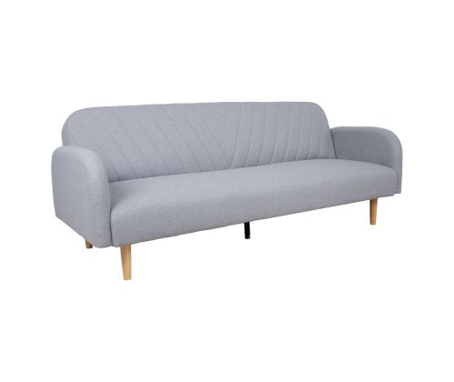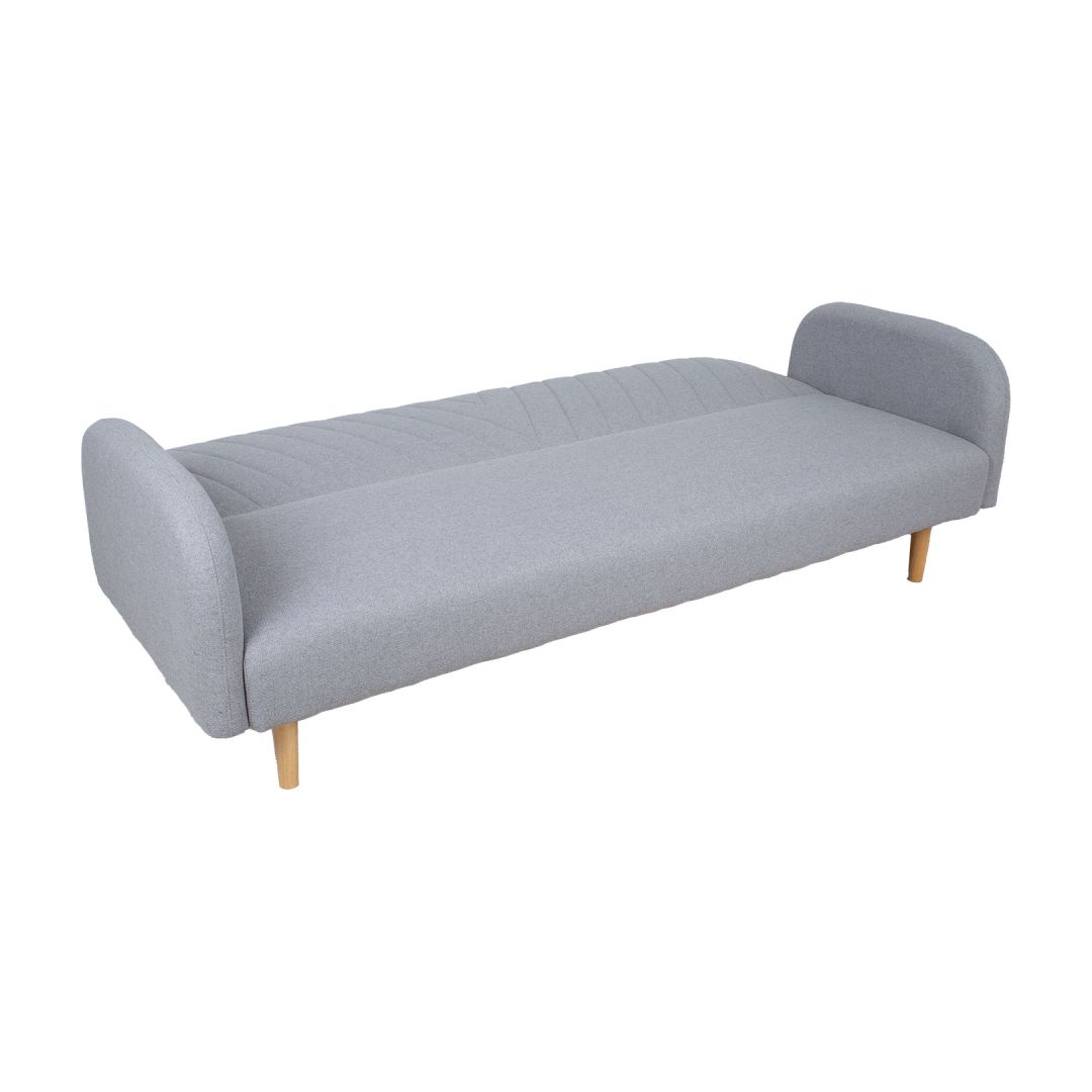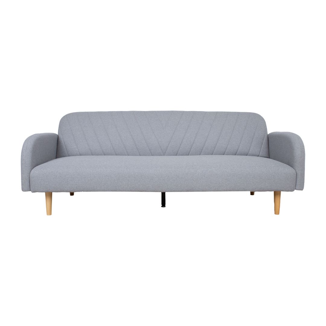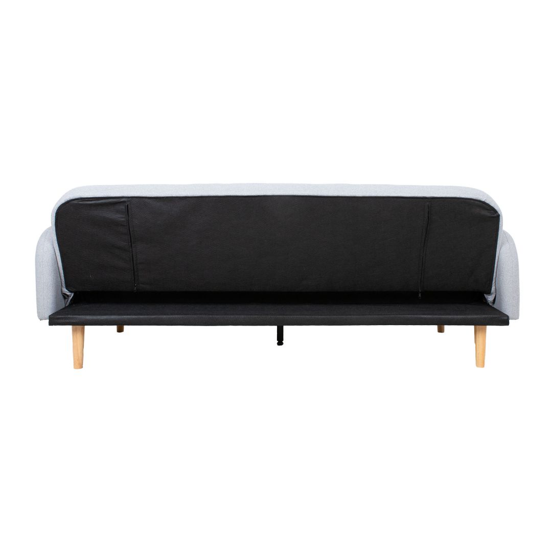Diivanvoodi KARIN 208x80x80cm, hall. Diivani kattematerjal: 100% polüesterkangas. Karkass ja vedrustus: puit, vineer, MDF, siksak vedrustus. Diivani polstris on kasutatud taaskasutatud porolooni. Diivanil on click-clack mehhanism, mille abil on lihtne muuta diivan magamisasemeks. Diivani üldmõõdud on 208x80xH80cm. Diivanvoodi mõõdud avatuna on 187x105xH41cm. Diivanil on heledad puidust jalad.