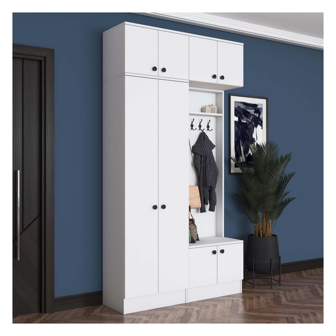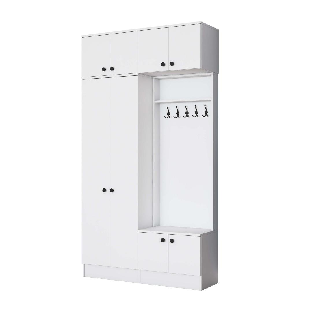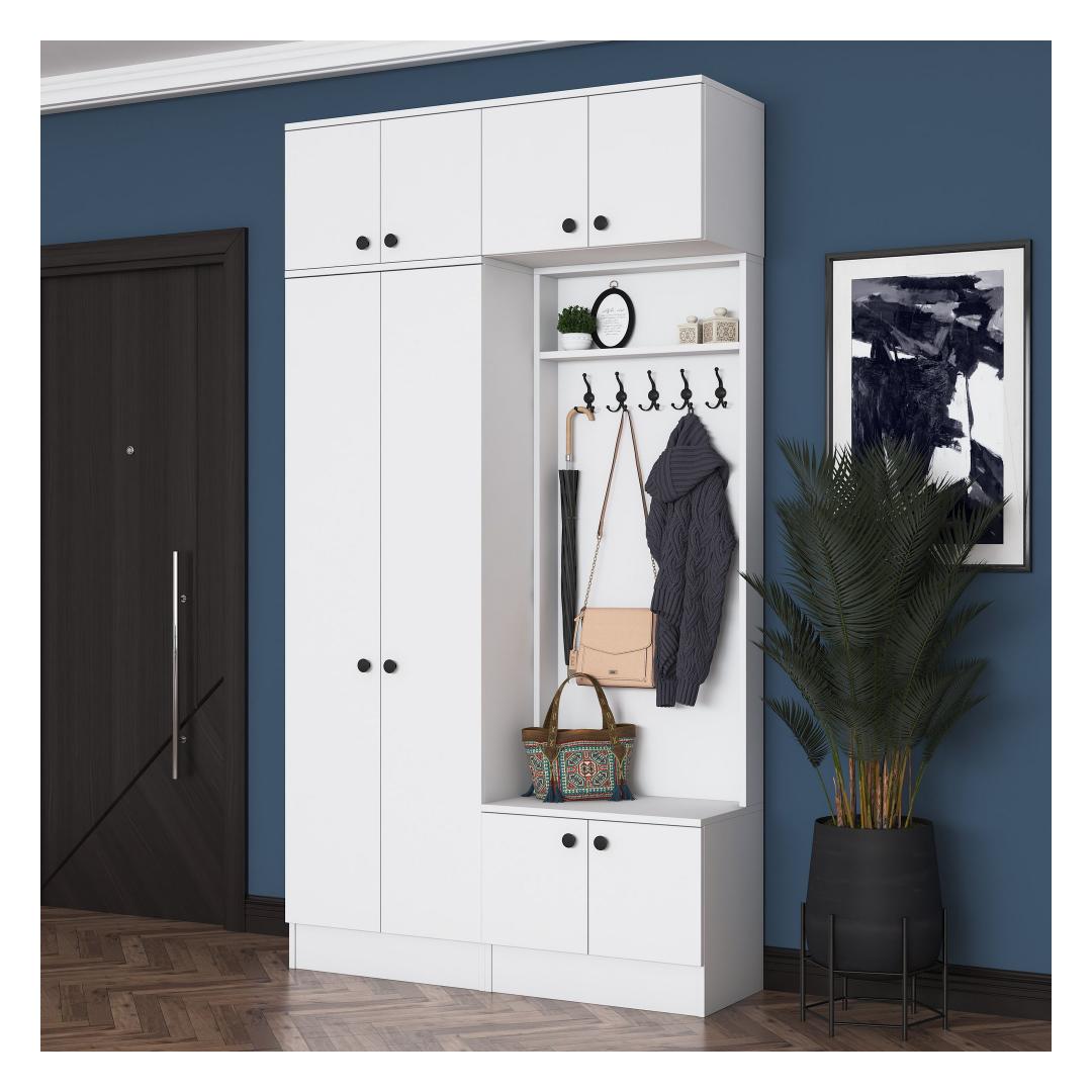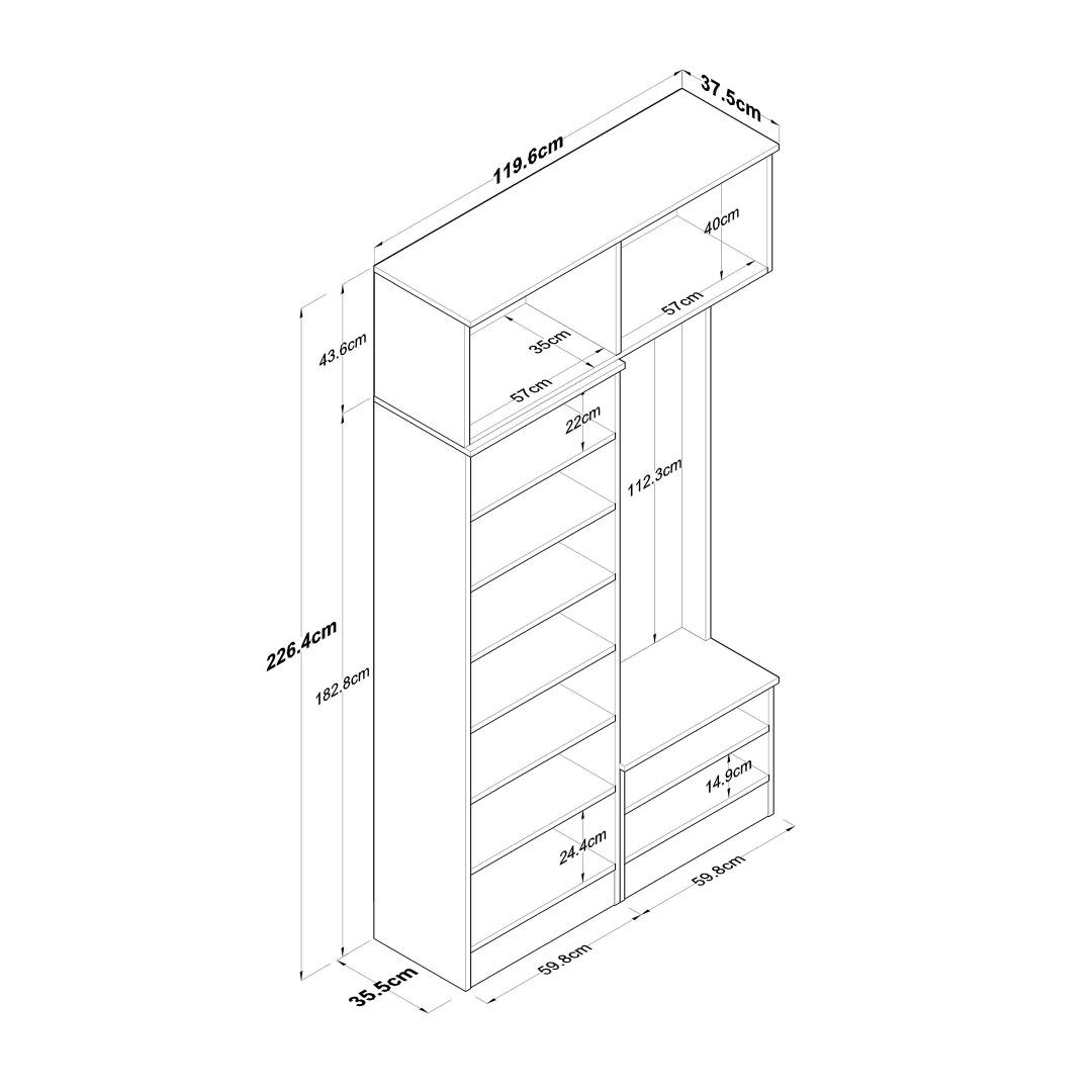 Laienedes 119,6 cm, kõrgus 226,4 cm ja sügavus 37,5 cm, on see esikupink kompaktne, kuid piisavalt avar, et mahutada kõik teie vajalikud asjad. Sleek valge värv lisab teie esikule puhta ja värske ilme, muutes selle mitmekülgseks osaks, mis sobib igasuguse sisustustootega.