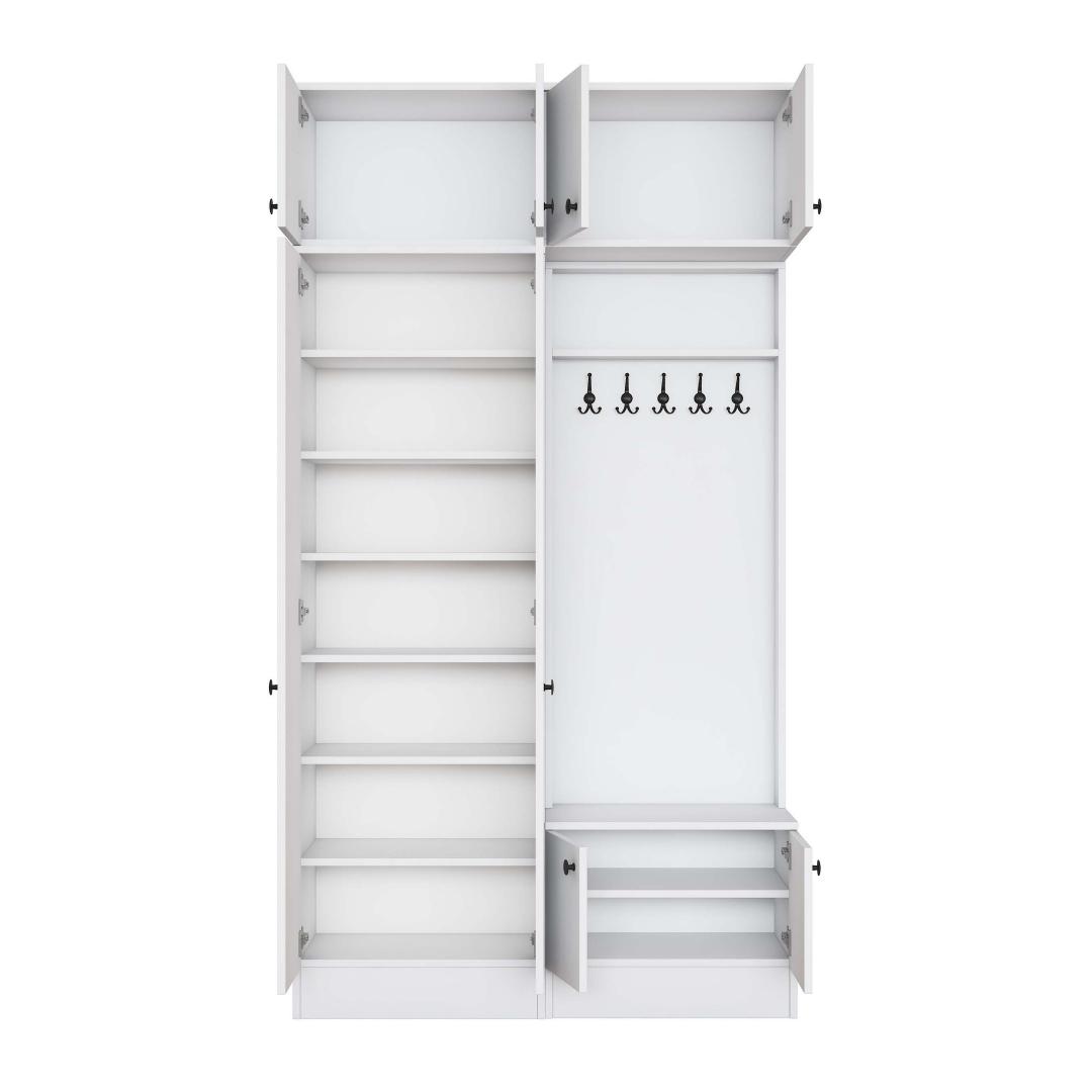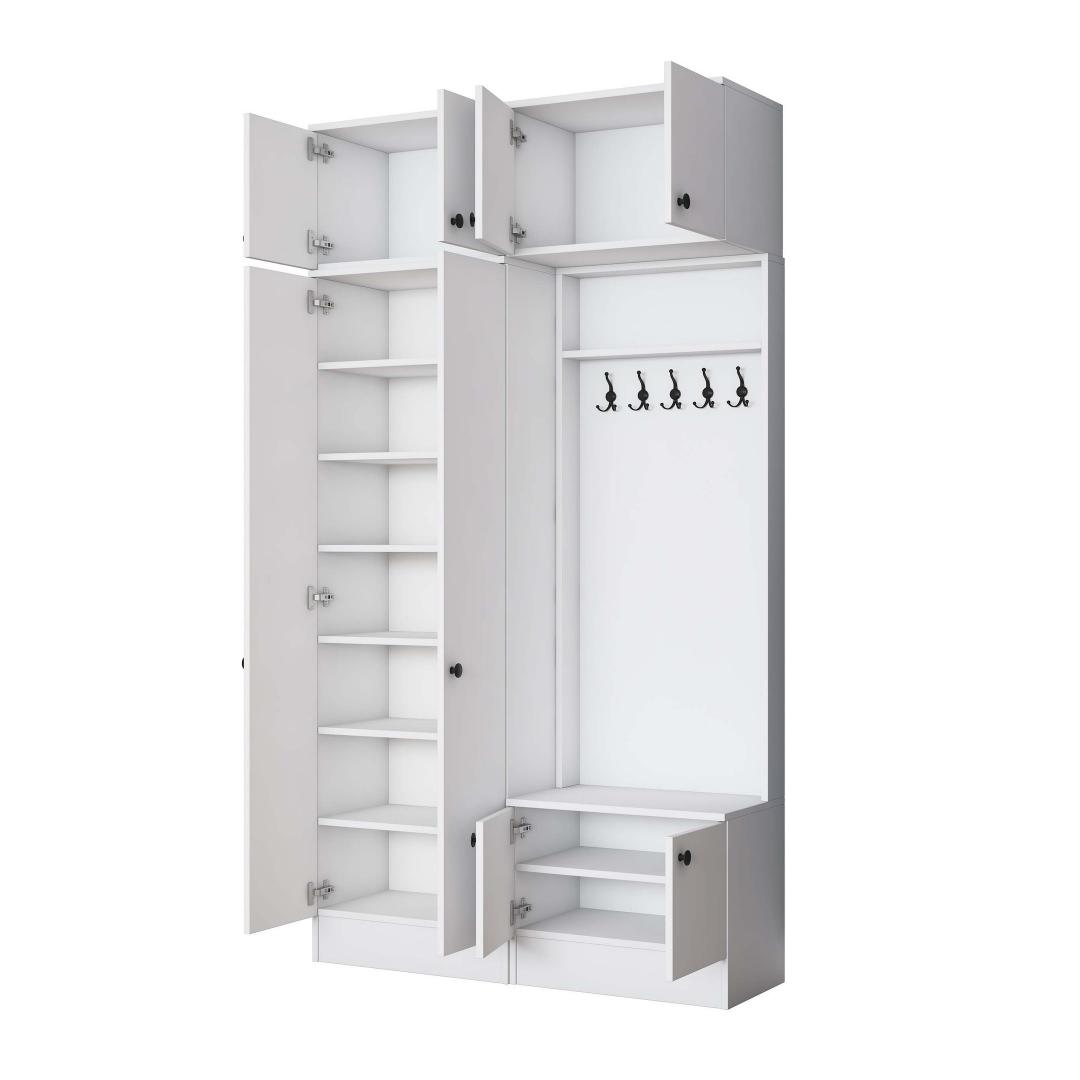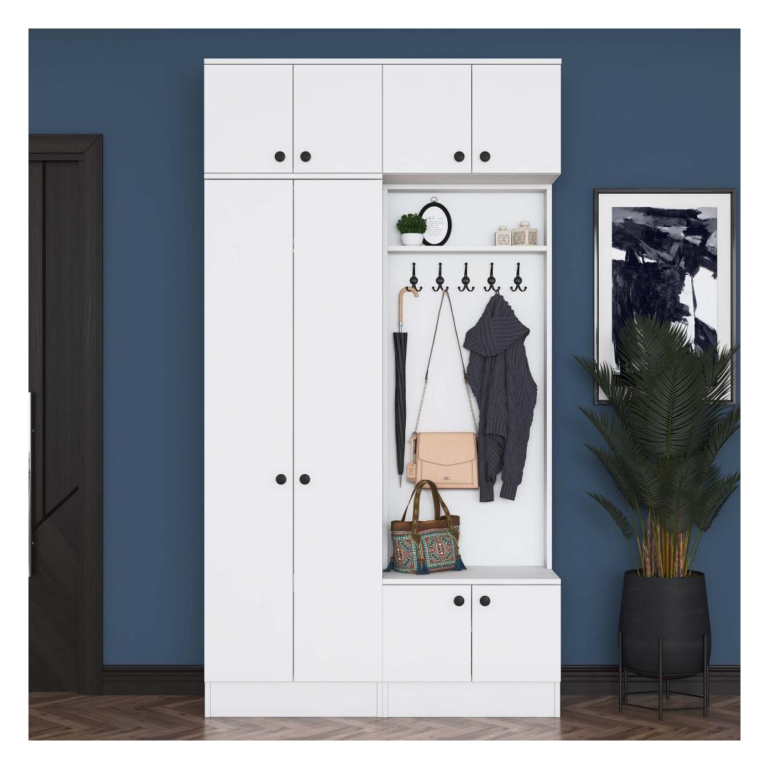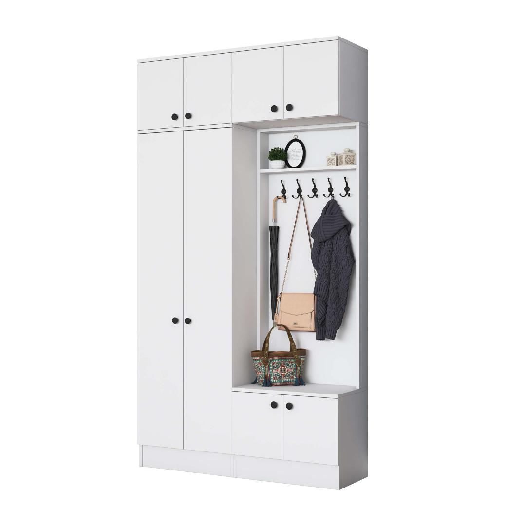 Laienedes 119,6 cm, kõrgus 226,4 cm ja sügavus 37,5 cm, on see esikupink kompaktne, kuid piisavalt avar, et mahutada kõik teie vajalikud asjad. Sleek valge värv lisab teie esikule puhta ja värske ilme, muutes selle mitmekülgseks osaks, mis sobib igasuguse sisustustootega.