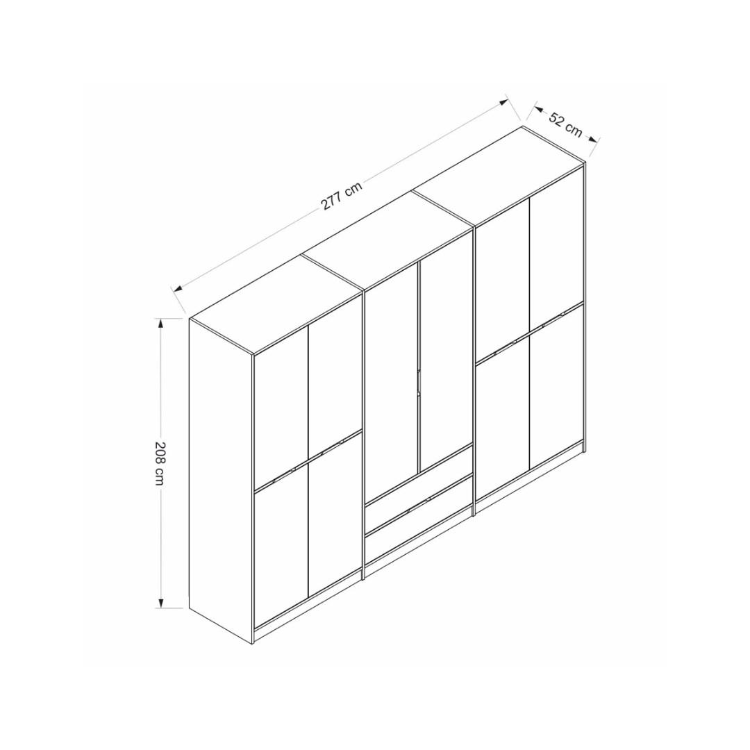 Kujuta ette, et astud oma magamistuppa ja näed, et kõik on korralikult organiseeritud selles avaras garderoobis. Laiusega 277 cm, kõrgusega 208 cm ja sügavusega 52 cm on piisavalt ruumi kõigi sinu riiete, kingade ja aksessuaaride jaoks. Rohked riiulid pakuvad piisavalt hoiuruumi, võimaldades sul hoida kõike oma kohas.