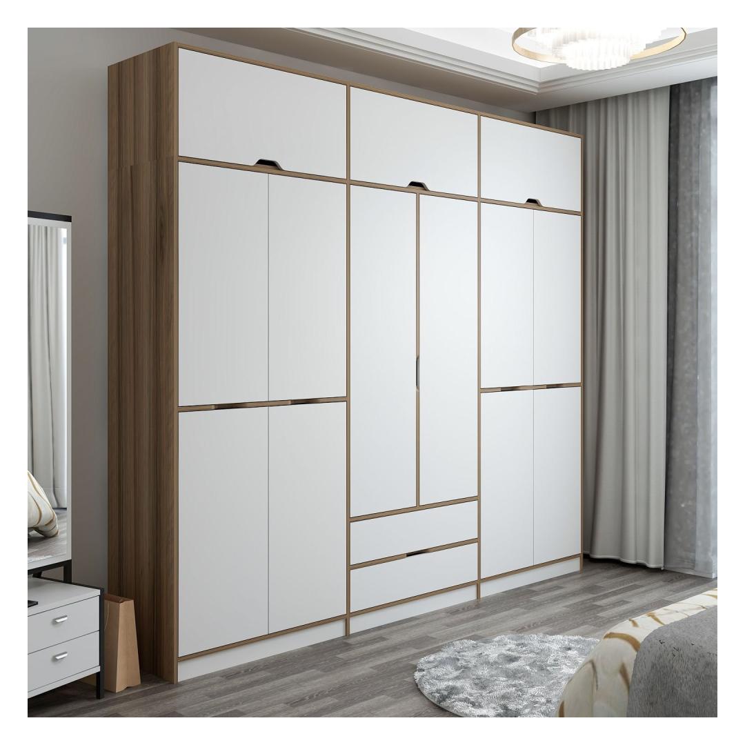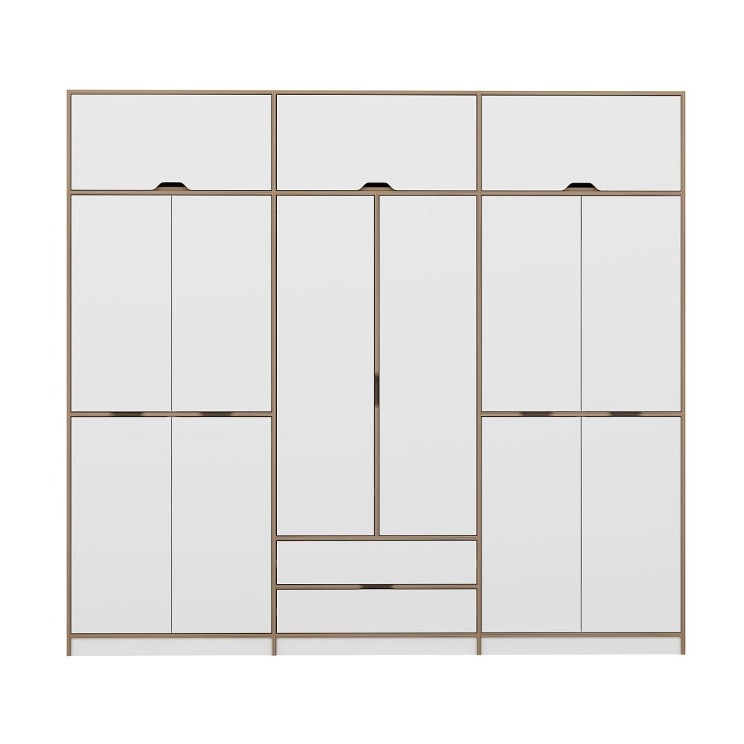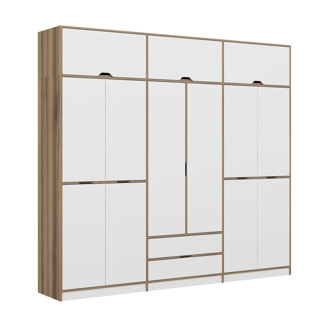 Selle riidekapi klanitud disain, mis sisaldab valgete ja dore -värvide kombinatsiooni, tõstab kohe iga ruumi ilme. Ükskõik, kas asetate selle oma magamistuppa, koridori või riietusruumi, teeb see riidekapp kindlasti avalduse.