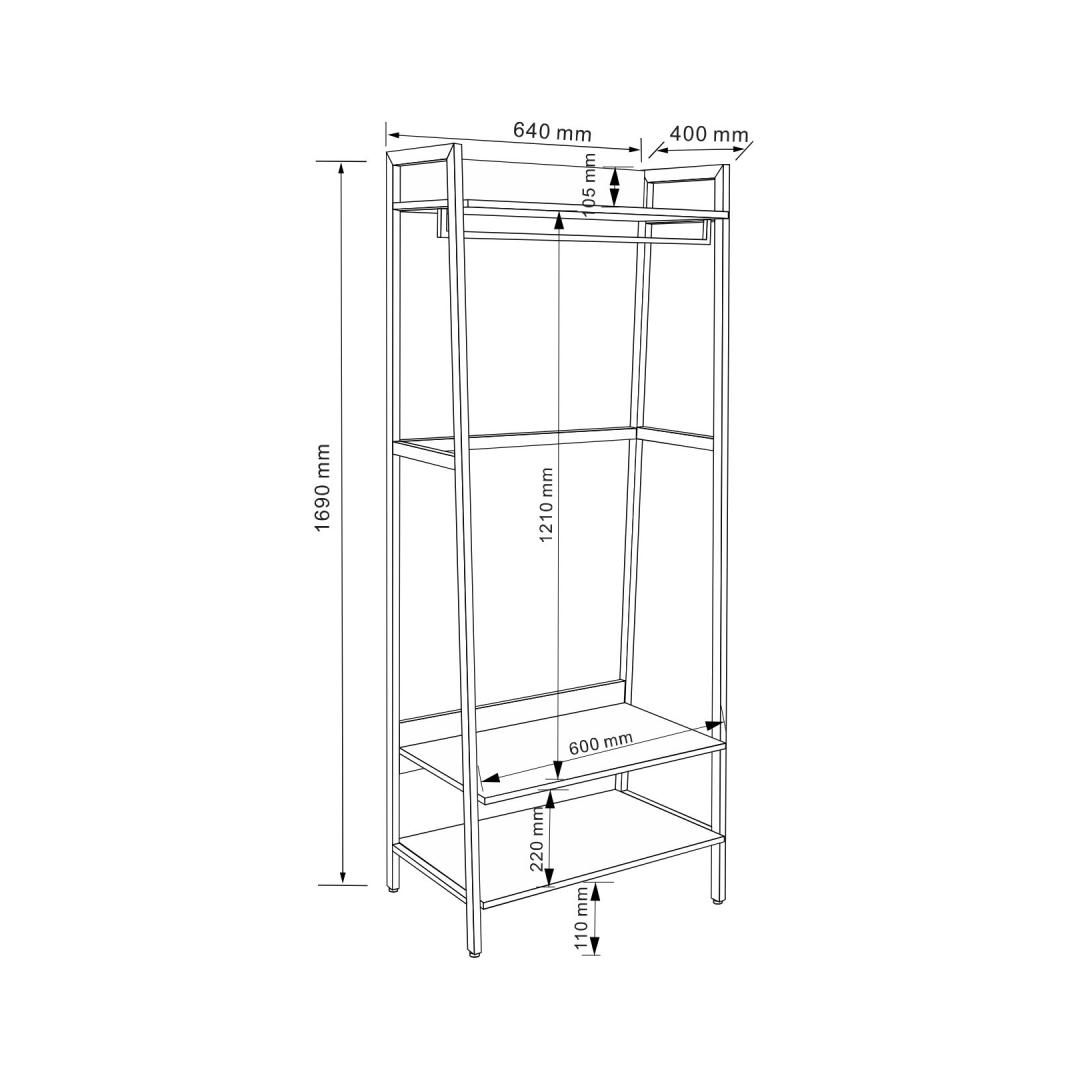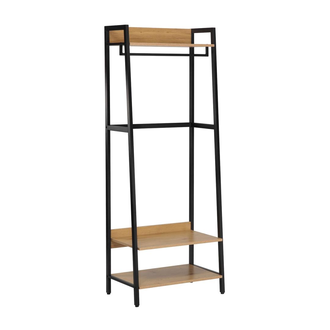 Esikuriiul LAVINIA stangega 64x40xH169cm, saar/must. Riiuli raam on valmistatud metallist ja viimistletud musta pulbervärviga. Riiulid on valmistatud saaredekooriga melamiinplaadist.