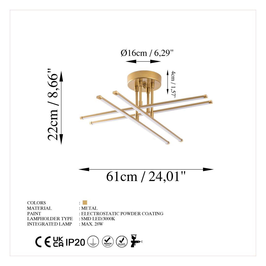 Transformeeri oma ruum elegantsi ja glamuurigaTutvustame teile meie peen lühtrit, mis on meistriteos, mis tõstab koheselt mis tahes ruumi atmosfääri. See lühtri on oma lummava disaini ja luksusliku kuldse värviga keerukuse ja stiilsuse kehastus. Vabastage metalli võimsusTugevast metallist korpusest valmistatud lühtrile on omane vastupidavus ja tugevus. Metallist alusplaat tagab stabiilsuse, lisades samas kogu disainile modernsust.Valgustage oma maailma61 cm laiuse ja 22 cm kõrgusega lühtri valgustus on piisav, et valgustada mis tahes ruumi. Smd-led lambipesa tüüp ja led 28w pesa tüüp tagavad kauakestva ja energiasäästliku valgustuse, mis võimaldab teil luua sooja ja kutsuva atmosfääri. Täiuslik disain, võrratu iluSelle lühtri keerulised detailid ja laitmatu käsitöö teevad sellest tõelise kunstiteose. Selle elegantne kuldne värvus lisab teie ruumile külluslikkust ja suursugusust, muutes selle tähelepanu keskpunktiks. Tehnilised üksikasjad:Metallist korpus tagab vastupidavuse ja tugevuseMetallist alusplaat stabiilsuse ja kaasaegse disaini tagamiseksLaius: 61 cm, kõrgus: 22 cm, sügavus: 61 cmAlusplaadi läbimõõt: 16 cm, alusplaadi kõrgus: 4 cmIP 20 klassifikatsioon ohutuks kasutamiseks siseruumidesLambipesa tüüp: SMD LedPesa tüüp: LED 28WVärv: kuldneKoge luksuse iluHellitage end luksuse ilu meie uimastava lühtriga. Olgu see teie elutuppa, söögituppa või magamistuppa, see lühtri muudab teie ruumi elegantsi ja glamuuri paradiisiks. Ärge jätke kasutamata seda võimalust, et lisada oma koju elegantsi. Telli kohe ja lase lummusel alata! Värv: Gold