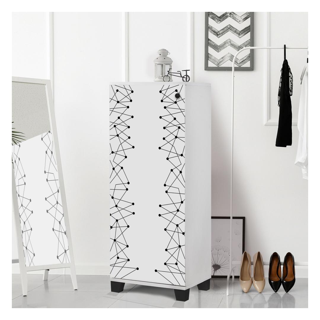 Oma elegantse disaini ja kontrastse valge ja musta värviga lisab meie kingakapp elegantsi igasse ruumi. Selle kaasaegne kontseptsioon tagab, et see sulandub sujuvalt teie olemasoleva sisustusega, muutes selle täiuslikuks täienduseks teie kodule.