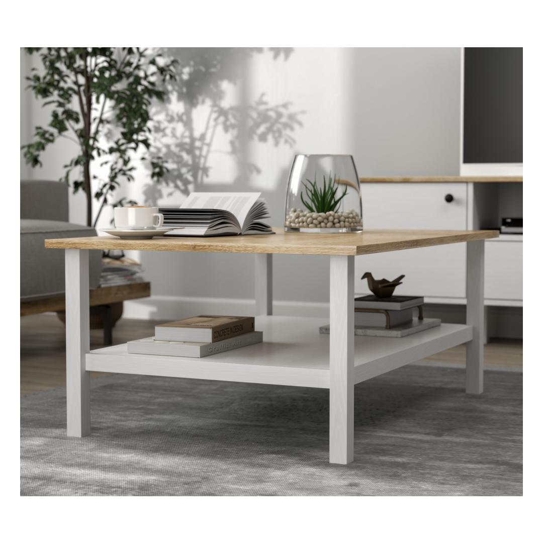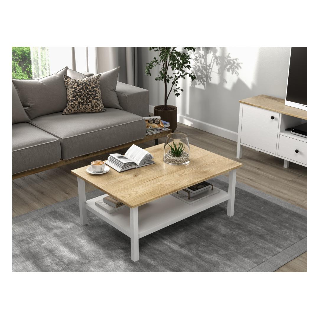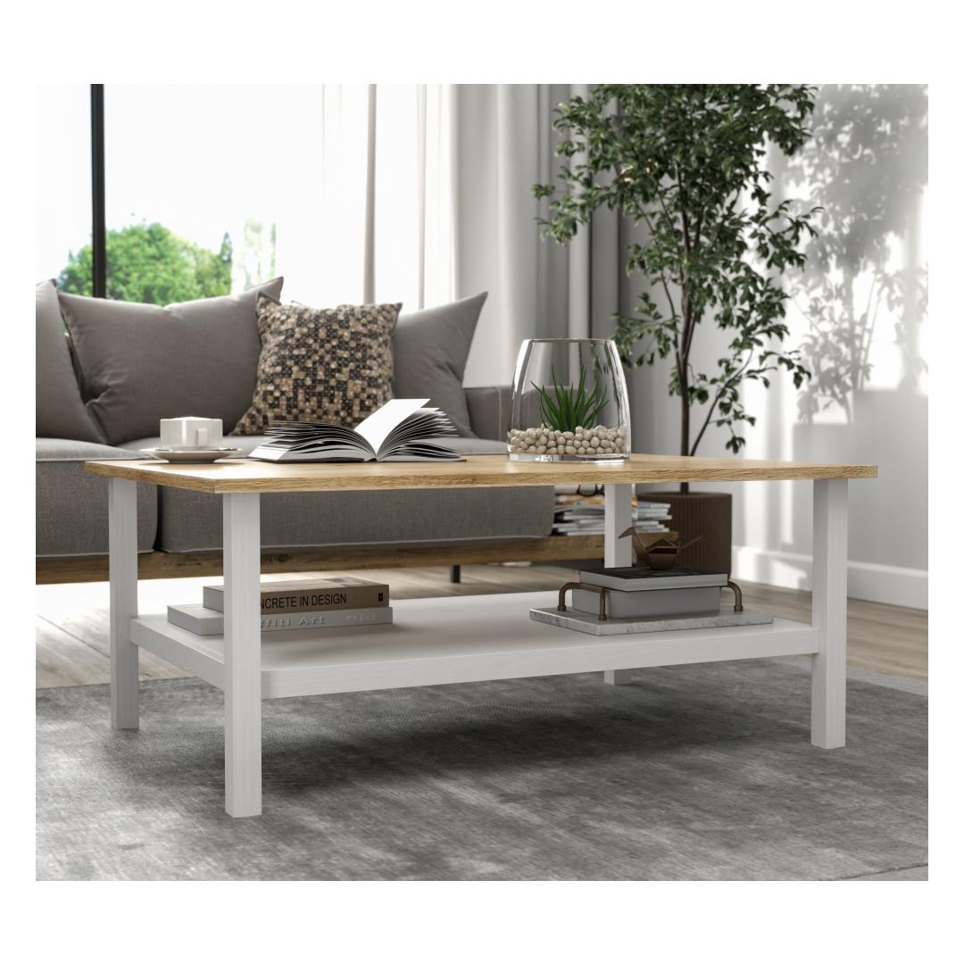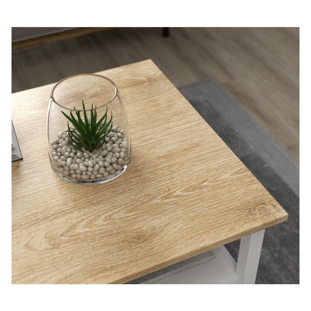 Lisa oma koju natuke kaasaegset elegantsi selle hämmastava kohvilaudaga. Puit- ja valgete värvide kombinatsioon loob šiki ja kaasaegse ilme, mis tõstab koheselt sinu elutoa sisustust. Rohked riiulid pakuvad piisavalt hoiuruumi kõigi sinu oluliste asjade jaoks, hoides ruumi organiseerituna ja segaduseta.