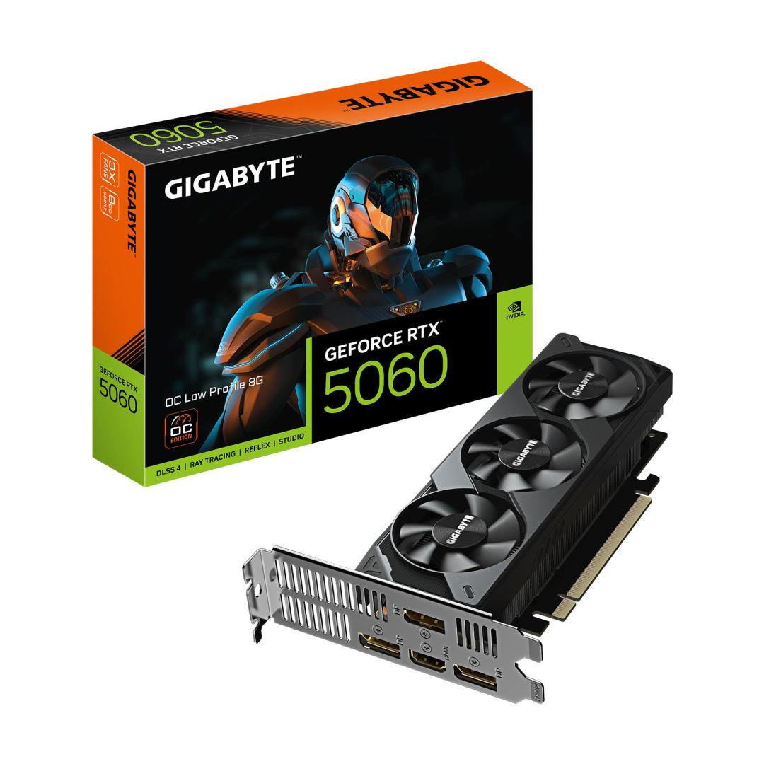 GIGABYTE GeForce RTX 5060 OC Low Profile 8G Graphics Card - 8GB GDDR7, 128bit, PCI-E 5.0, 2512 MHz Core Clock, 3 x DisplayPort, 1 x HDMI, GV-N5060OC-8GL. Graphics processor family: NVIDIA, Graphics processor: GeForce RTX 5060, Processor frequency: 2512 MHz. Discrete graphics card memory: 8 GB, Graphics card memory type: GDDR7, Memory bus: 128 bit, Memory clock speed: 28000 MHz. Maximum resolution: 7680 x 4320 pixels. DirectX version: 12.0, OpenGL version: 4.6. Interface type: PCI Express 5.0. Cooling type: Active, Number of fans: 3 fan(s)