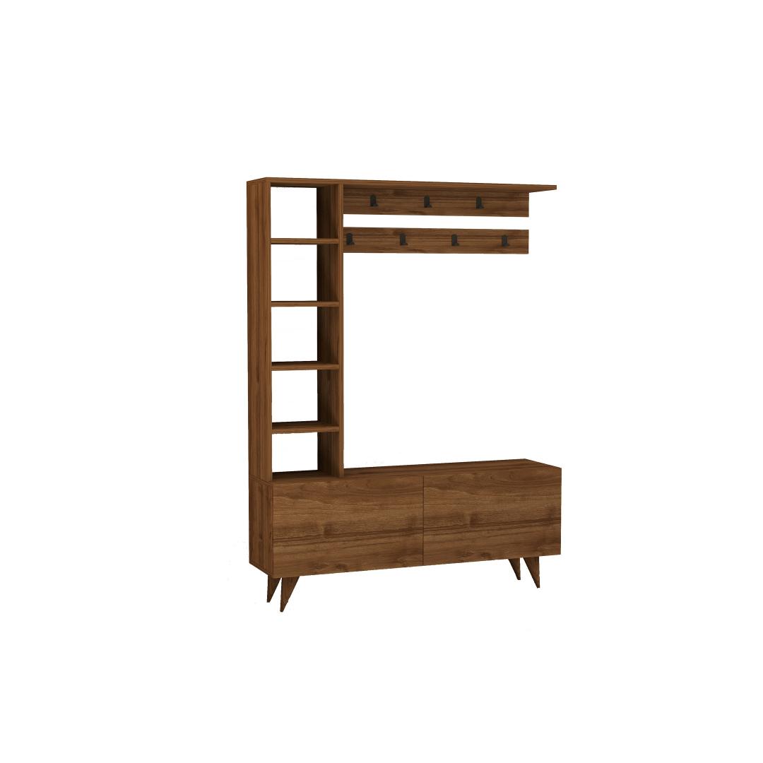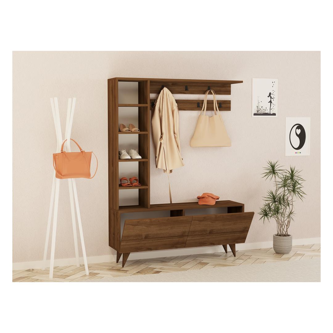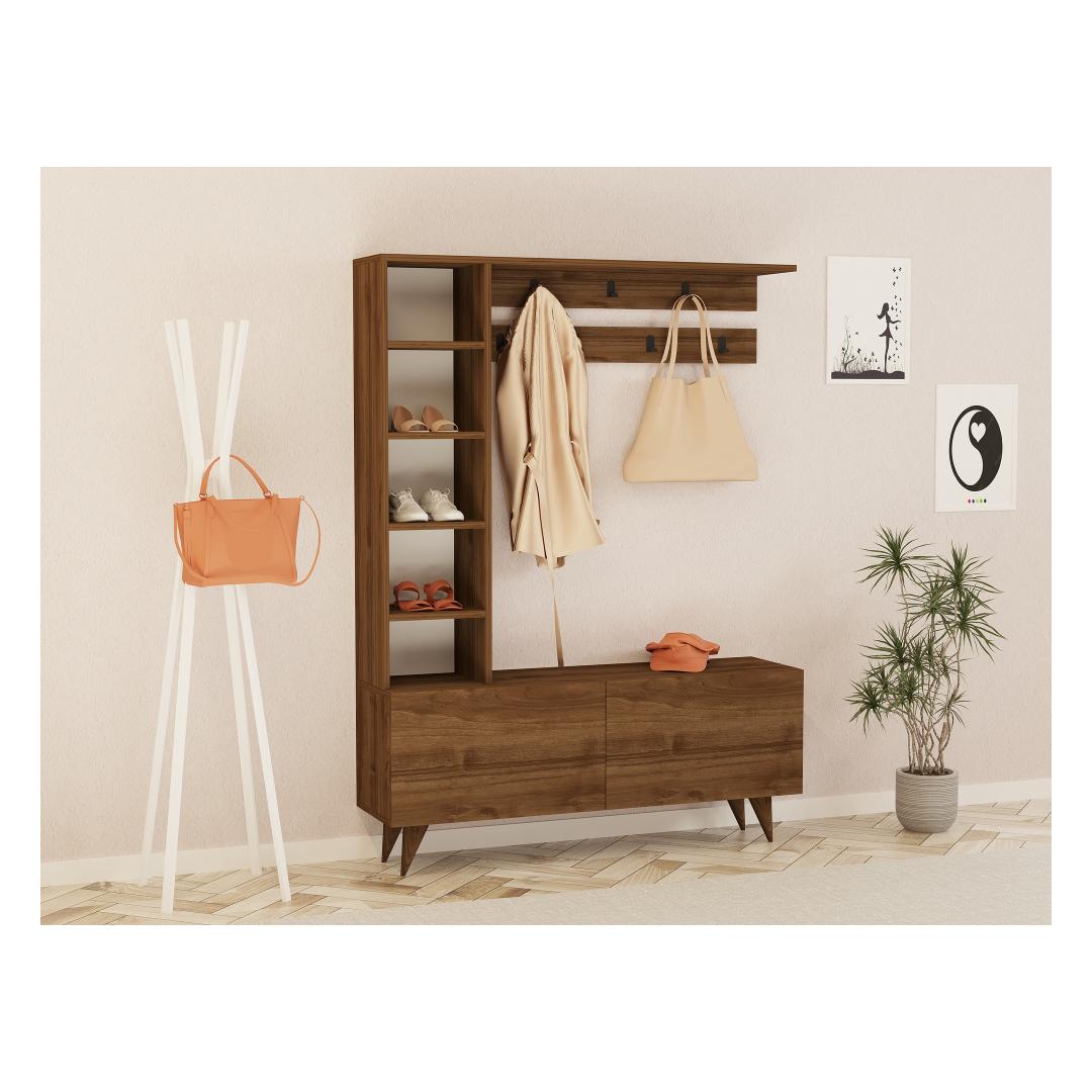 Tänu oma elegantsele disainile ja pähklipuidust värvile täiendab see saalihoidja vaevata mis tahes sisekujundust. Selle avarad riiulid pakuvad piisavalt ruumi teie igapäevastele esmatarbekaupadele, samal ajal kui ülemine pind sobib ideaalselt teie lemmikdekoratsioonide eksponeerimiseks. Hoidke oma võtmed, posti ja muud esemed organiseeritult ja hõlpsasti kättesaadavana.