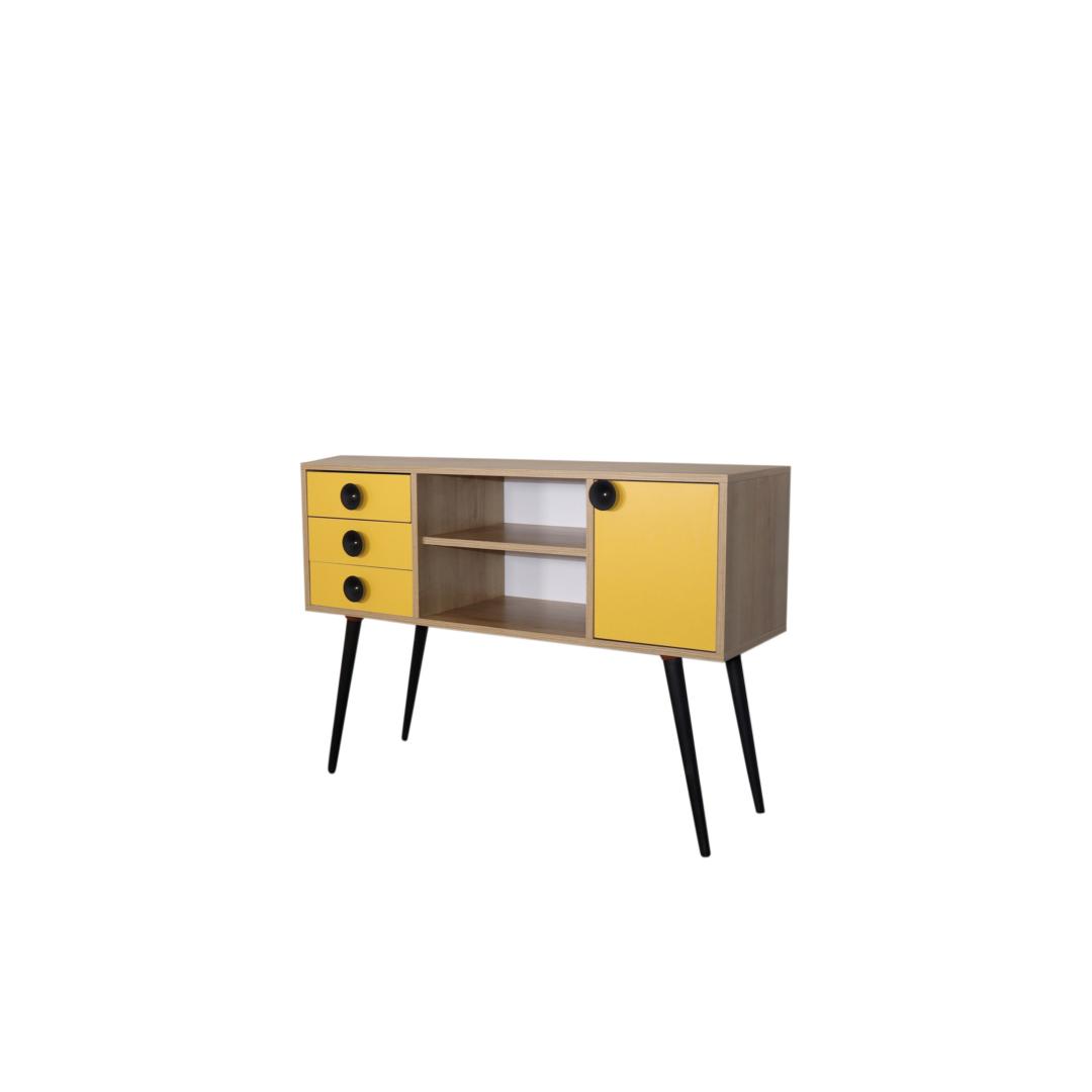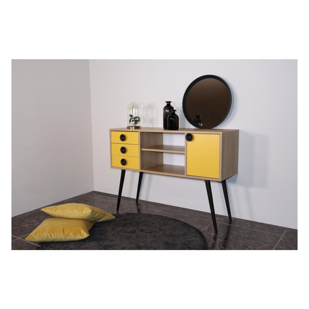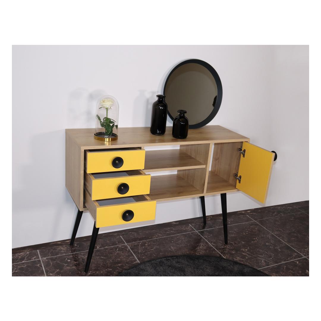 Transformeeri oma eluruum meie moodsa ja uuendusliku konsooliga!Lisage oma koju elegantsi ja stiili meie konsooliga, mis on loodud iga ruumi kaunistamiseks. See 100% melamiiniga kaetud puitlaastplaadist valmistatud konsool on valmistatud kestma ja vastu pidama igapäevasele kulumisele. Selle 18 mm paksus tagab vastupidavuse ja stabiilsuse, mis teeb sellest usaldusväärse valiku teie koju.Tugev ja stiilne disainPuidust jalgade ja metallist käepidemega konsool õhkab elegantsust ja võlu. Tamme ja kollase värvi kombinatsioon loob visuaalselt atraktiivse kontrasti, lisades teie ruumile värvi. Selle konsooli stiilne ja kaasaegne disain sobitub vaevata mis tahes sisustusstiiliga, muutes selle mitmekülgseks valikuks teie koju. Rikkalik panipaikKolme mahuka sahtli ja arvukate riiulitega pakub see konsool rohkelt hoiuruumi kõigile teie asjadele. Korraldage oma hädavajalikke asju, esitlege oma lemmikdekoori või hoiustage oma meediaseadmeid hõlpsasti. Sahtli laius 35 cm ja keskmise riiuli laius 55 cm pakuvad mitmekülgsust eri suurusega esemete hoiustamiseks. Monitoorne ja praktilineSee konsool ei ole mitte ainult stiilne, vaid ka praktiline. Selle 40 cm pikkune jala kõrgus võimaldab hõlpsasti selle alt puhastada, samas kui võimalus kinnitada see seinale tagab stabiilsuse ja ohutuse. Olenemata sellest, kas paigutate selle elutuppa, koridori või magamistuppa, see konsool tõstab koheselt teie ruumi välimust ja tunnetust. Tehnilised üksikasjad:Toote tüüp: Toode on väga lihtne ja lihtne: KonsoolMaterjal: Materjal: Materjal: Materjal: Materjal: Materjal: Materjal: Materjal: Materjal: Materjal: materjal: 100% melamiiniga kaetud puitlaastplaatPaksus: 18 mmPuidust jalad ja metallist käepideLaius: 120 cm, kõrgus: 80 cm, sügavus: 40 cmSahtli laius: 35 cm, keskmise riiuli laius: 55 cm3 sahtlit ja mitu riiulitJalgade kõrgus: 40 cmSaab kinnitada seinaleVärv: Tamm ja kollane Värv: Oak Yellow